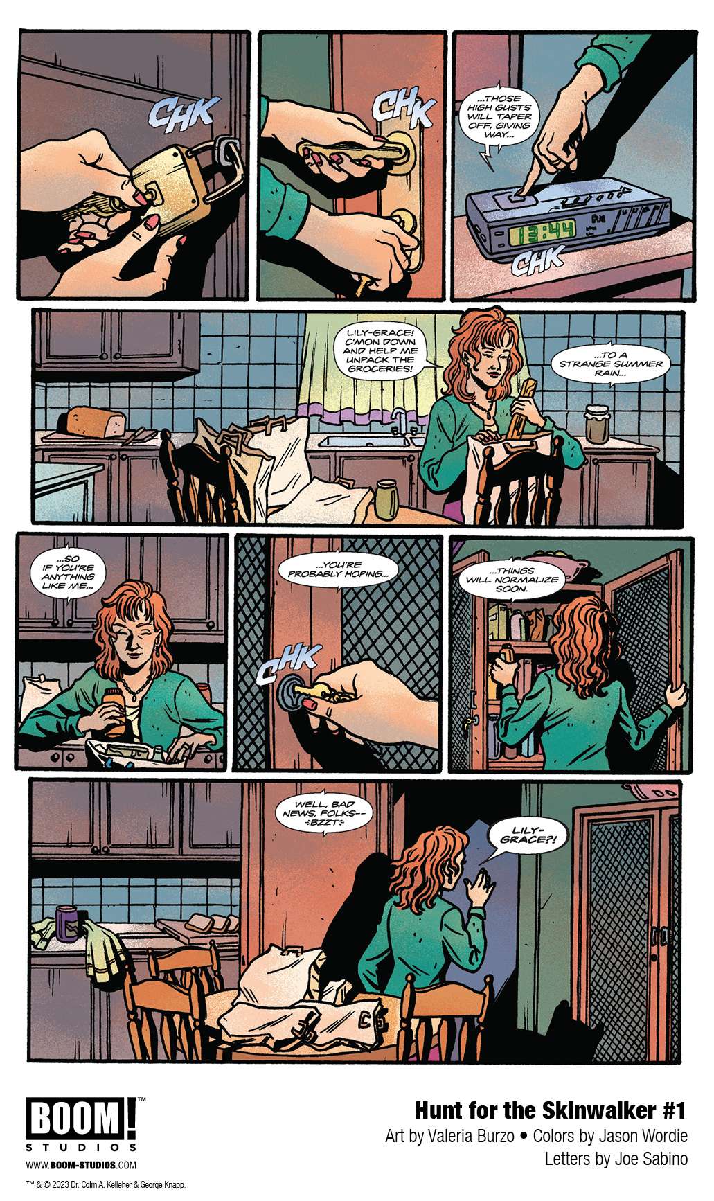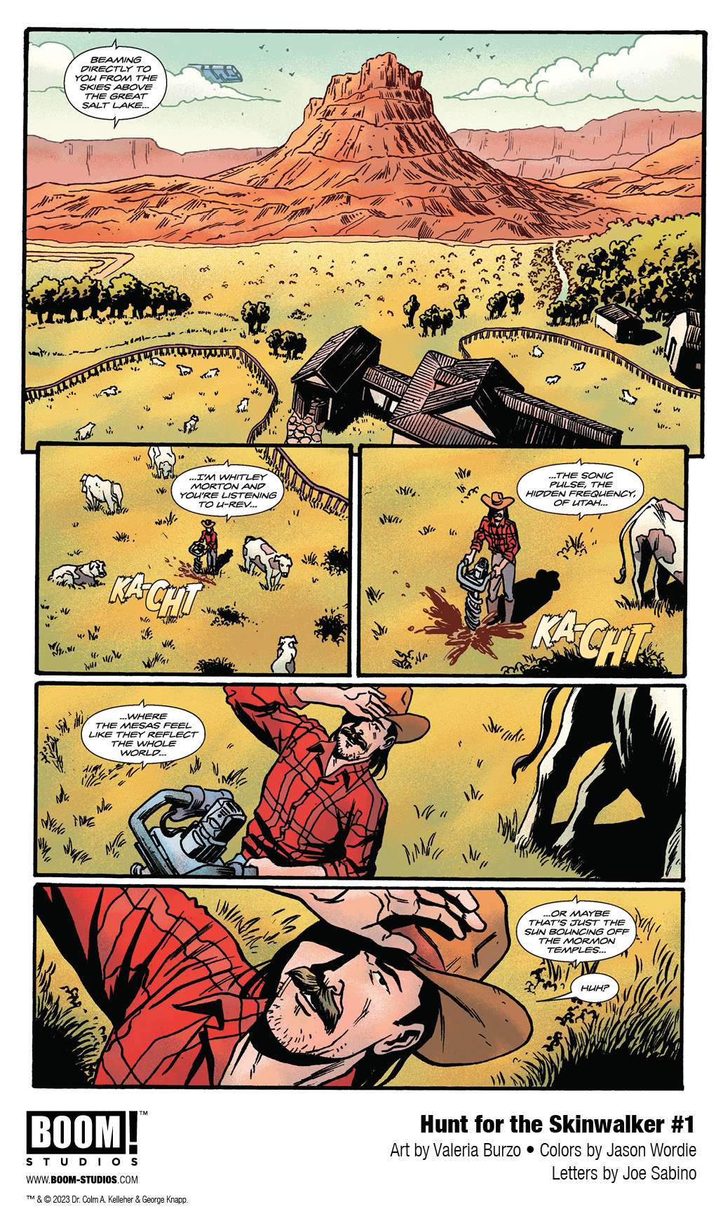 BOOM! Studios has revealed a first look at Hunt for the Skinwalker #1, the first issue in the brand new single issue series inspired by one family’s confrontation with the unexplainable and terrifying, and what happened when they invited the largest scientific investigation of the paranormal to their ranch. Working hand-in-hand with Dr. Colm Kelleher and George Knapp, and incorporating never-before-seen new revelations, writer Zac Thompson, artist Valeria Burzo, colorist Jason Wordie, and letterer Joe Sabino, adapts the category-defying, godfather of modern day paranormal research non-fiction book, Hunt for the Skinwalker, available in comic shops beginning on September 6, 2023.