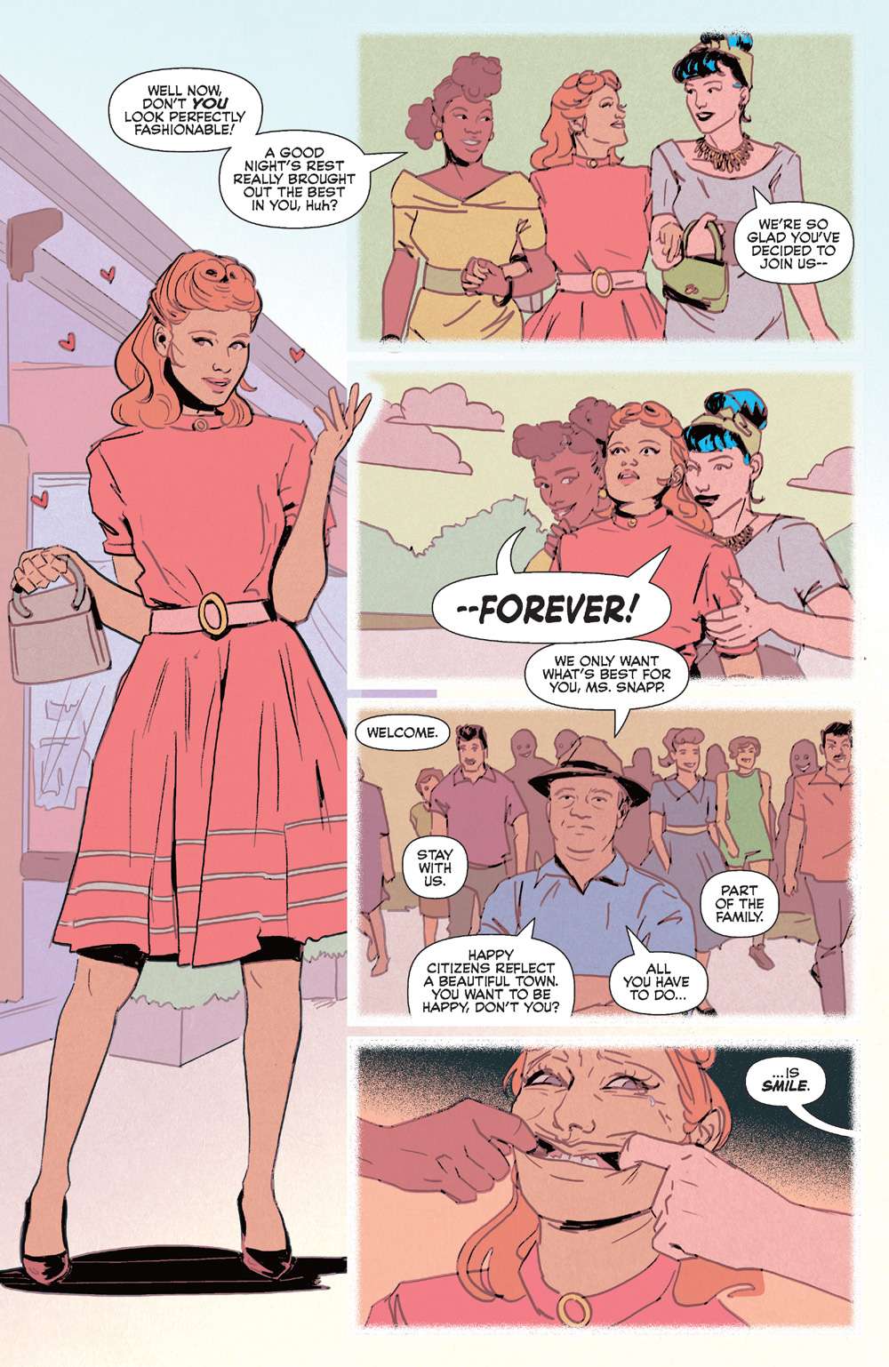 When Ginger Snapp finds herself in the town of Riverdale, a town she’s fanatically read about growing up, she’s amazed by how wholesome and welcoming it truly is. But she can’t help but shake the uncanny valley-feeling she has with every new person she meets. How can everyone be THIS nice? And could the kindness drive someone to the brink of madness, if it hasn’t already? Explore toxic positivity gone horror in this one-shot that’s equal parts Pleasantville and The Stepford Wives.