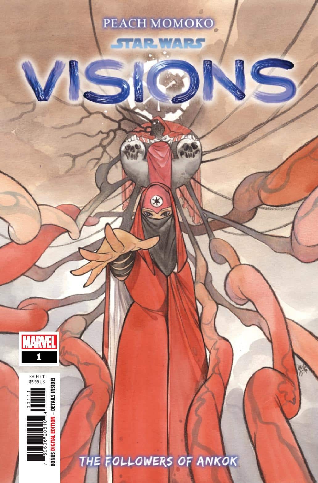 Star Wars: Visions #1 is an interesting comic. Wordless, it relies on Peach Momoko‘s beautiful art to convey the story. At its cory, the story is easy to understand. There’s a cult leader who is abusing their power and two individuals stand against them. But, beyond that general sense, it’s a little hard to figure out the specifics.