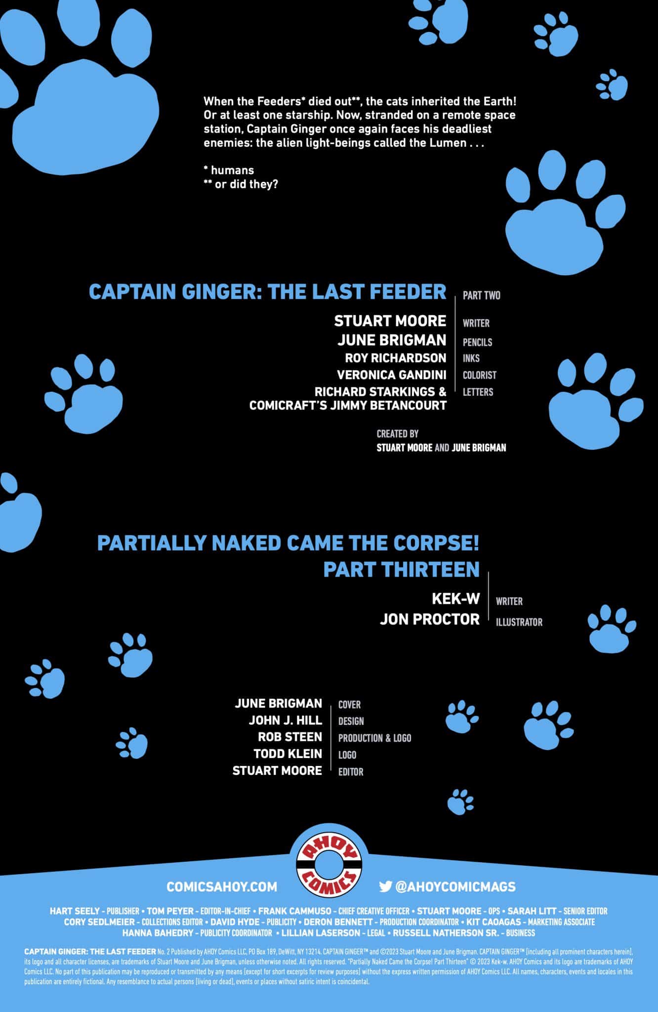 The action-packed conclusion! Under assault from all sides, Captain Ginger must choose between his father and the fate of his starship crew. But there’s a wild card in the deck: the mysterious Fourth People. Also featuring the mind-bending conclusion of PARTIALLY NAKED CAME THE CORPSE, the AHOY Fifth Anniversary prose serial!