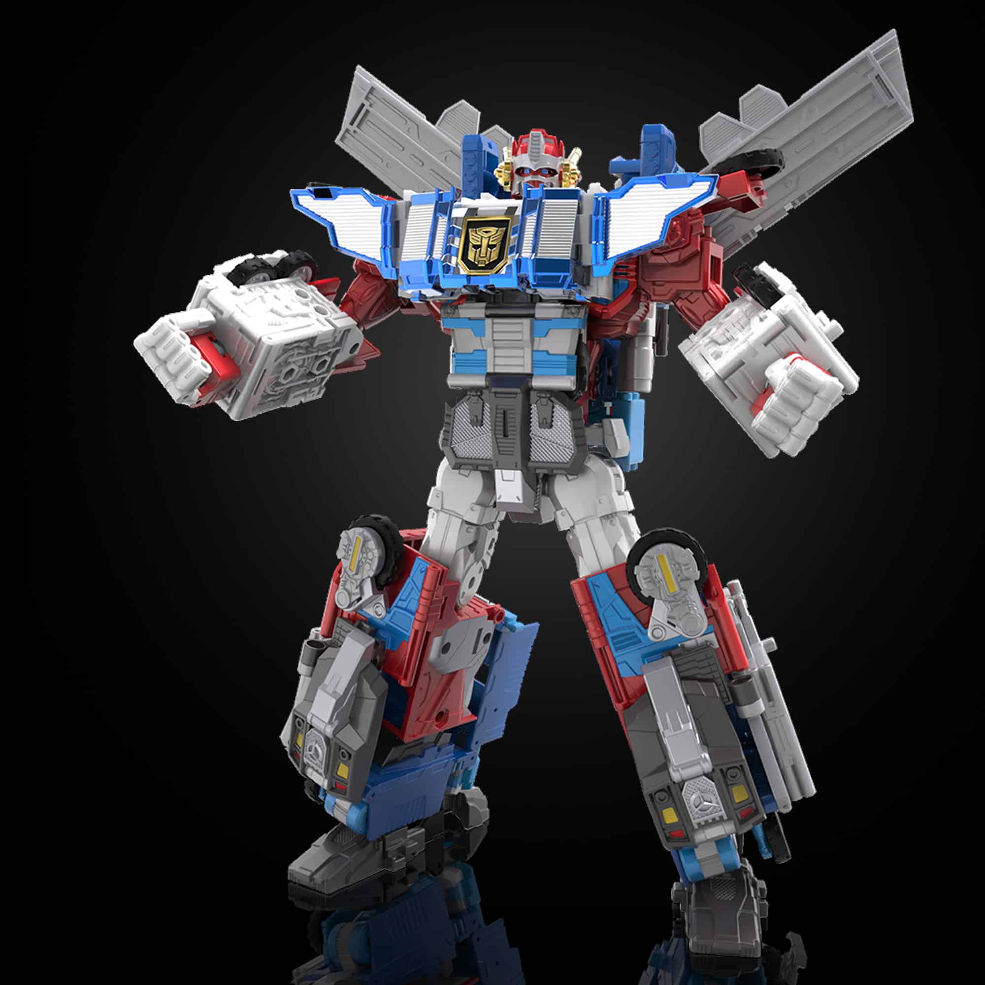 Power-hungry and greedy, Ultra Magnus forced Optimus Prime into a combined state with himself to steal the power of the Matrix of Leadership. The result: Omega Prime was created, a powerful combiner that both Optimus Prime and Ultra Magnus had equal control over. This HasLab project is the culmination of 40 years of Transformers innovation, leaning in heavily on everything fans loved about the original figure. The classic combination is still the star feature, with improved structural support and a sleek design to be able to withstand the awesome action poses of a hefty combiner.
