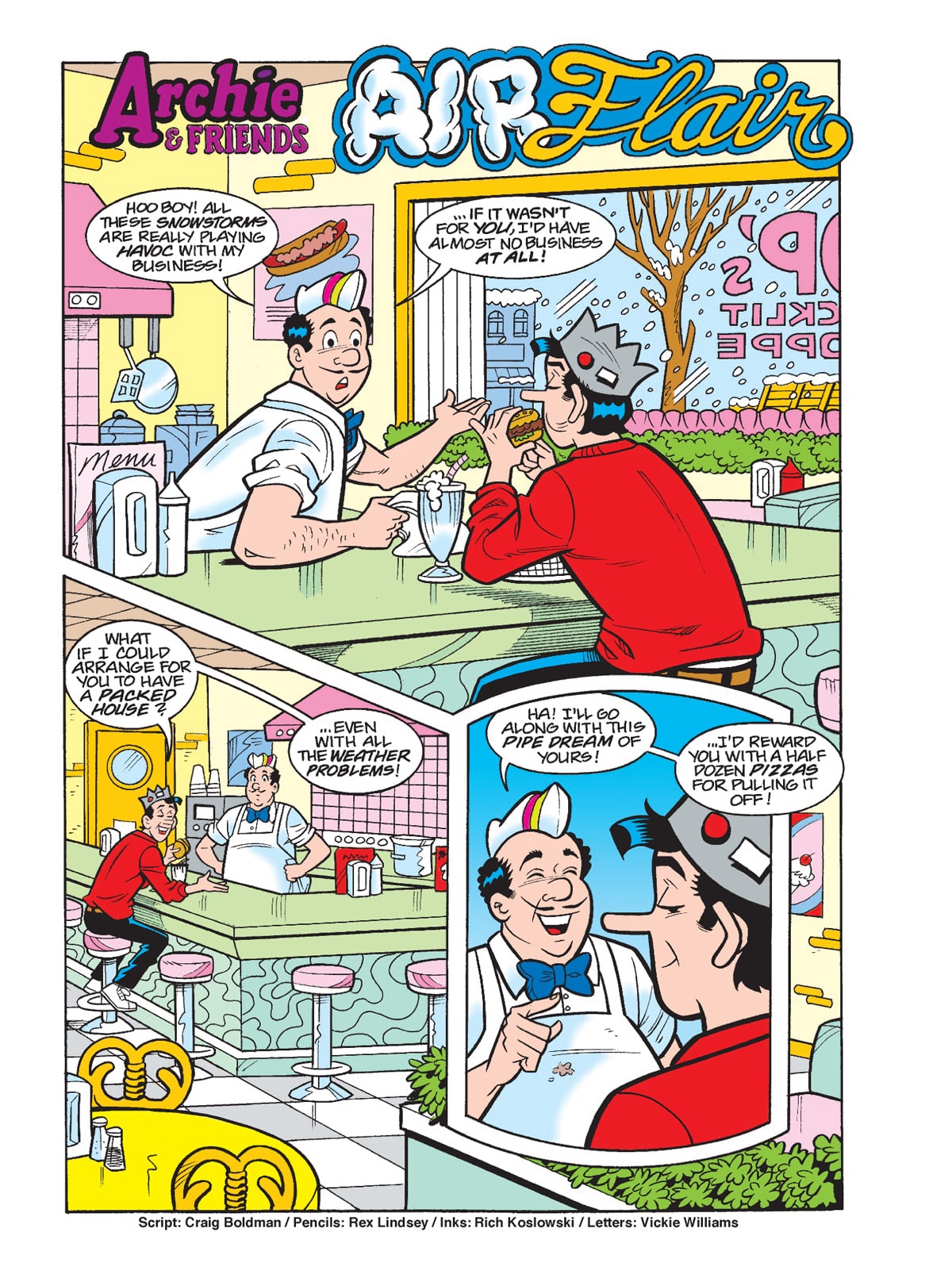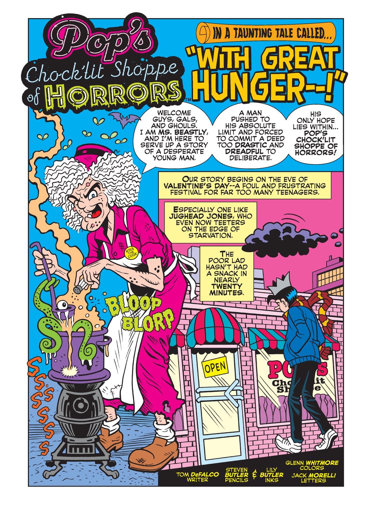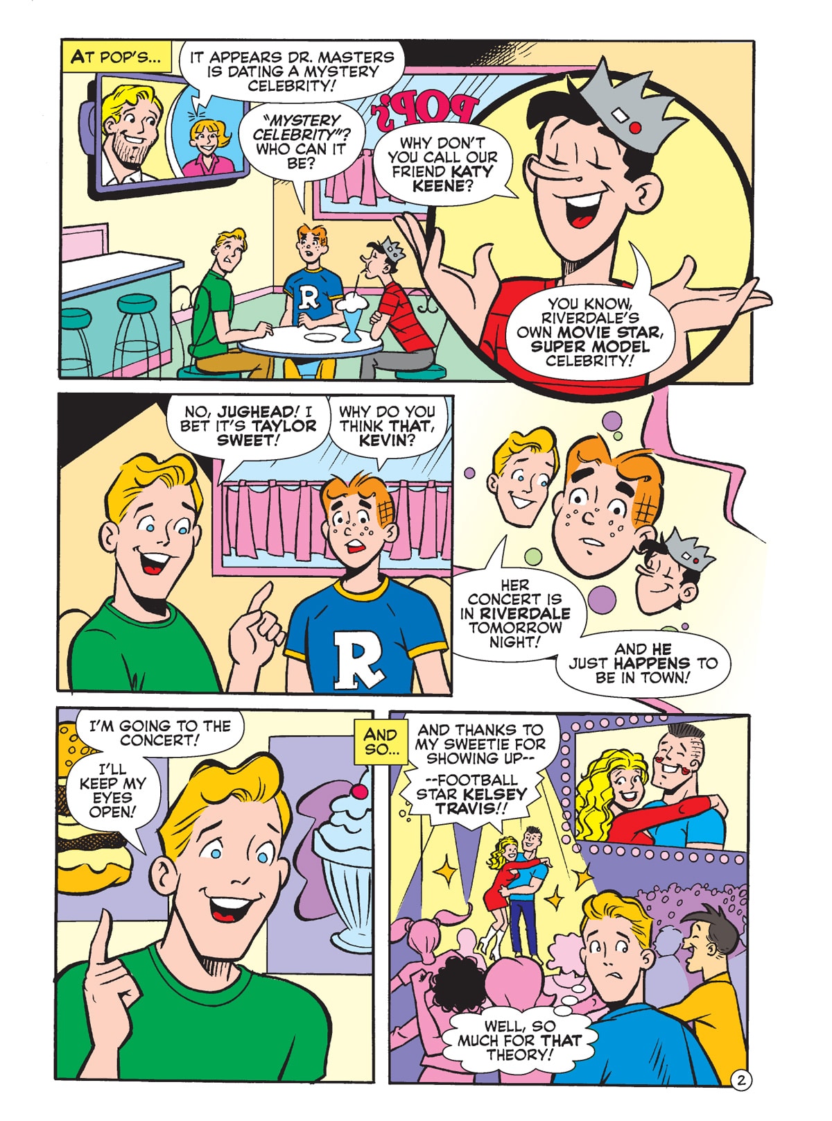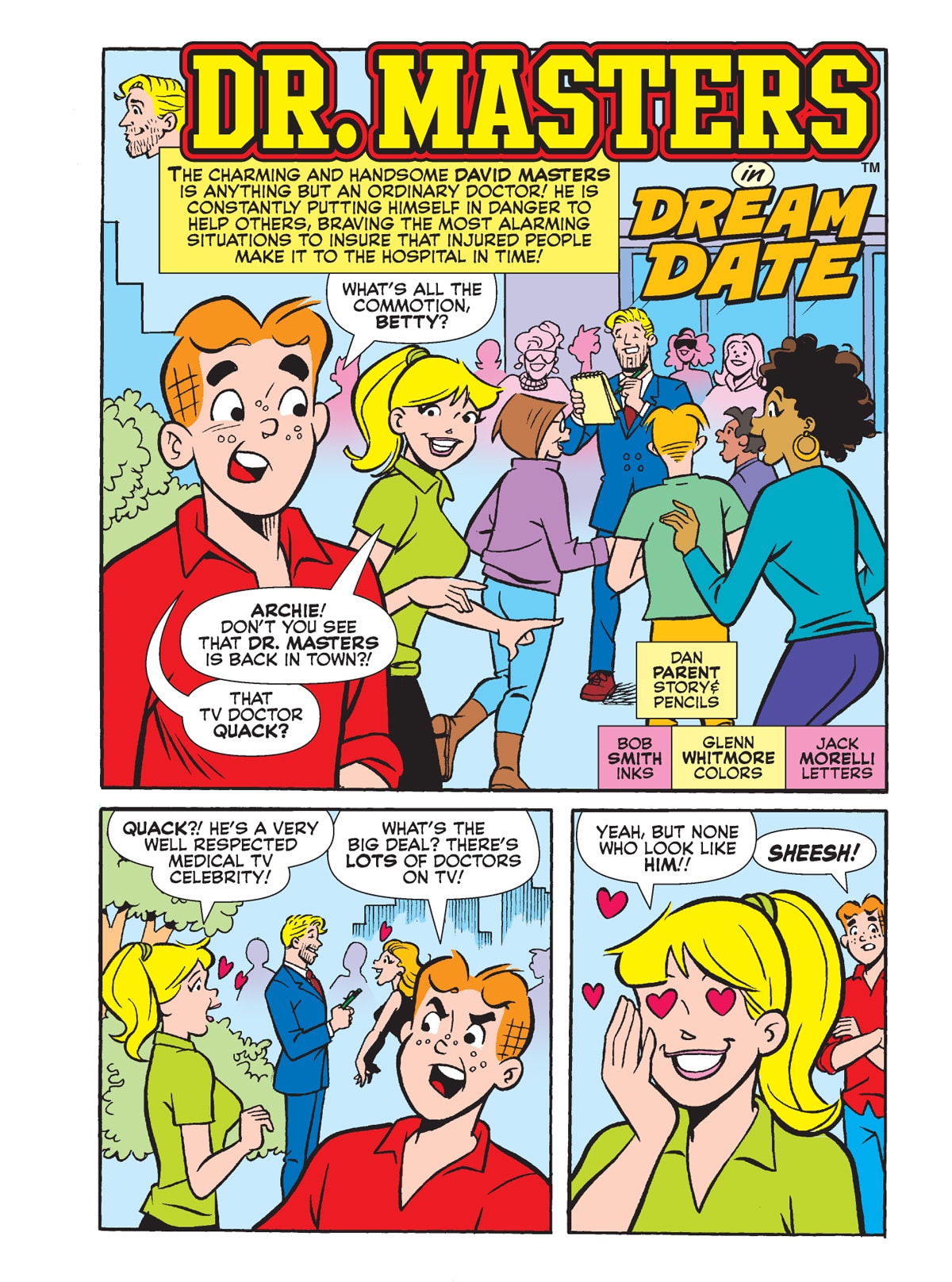 TWO BRAND NEW STORIES! First, On the most horrible holiday of all—Valentine’s Day—Jughead teeters on the edge of starvation at a Pop’s overrun with monsters! Then, Dr. Masters is in town, and word in the tabloids is that he’s dating a mystery celebrity! Can Archie and his friends figure out who it is?