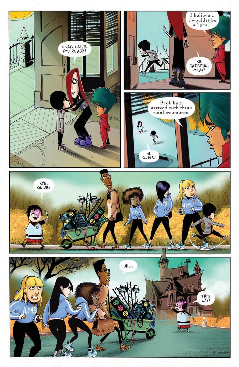 Our two stories come to a fitting conclusion, and you’re going to laugh until it hurts. I mean, what other reason is there to laugh anyway? In our lead story by Leah Williams teams with artist Juan Samu to tell a tale that raises your hair even as it relaxes it. The whole town has succumbed to a new health trend: milquetoast conformity. And when we say the whole town, that includes the Addams family. All but Wednesday have fallen under the spell to get well! Can she pull everyone out before they fall into this vanilla way of living completely? And in our second story, Chynna Clugston Flores and Francine Delgado give us the lowdown on what happens to the thief who dared break into the Addams family home.