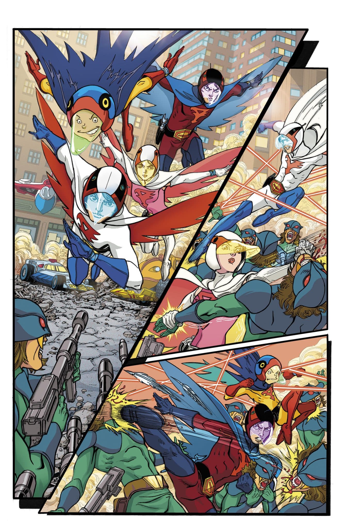 The ongoing story continues in Gatchaman #1 in June, with Cover A by Inaki Miranda, Cover B by Sanford Greene (which connects with the B covers for issues #2-5 to form a panoramic image), Cover C by Chris Batista, the Cover D Blank Sketch Cover edition, and Cover E retailer incentive by Francine Delgado. Trade paperback available in December, collecting the complete storyline from issues #0-5.