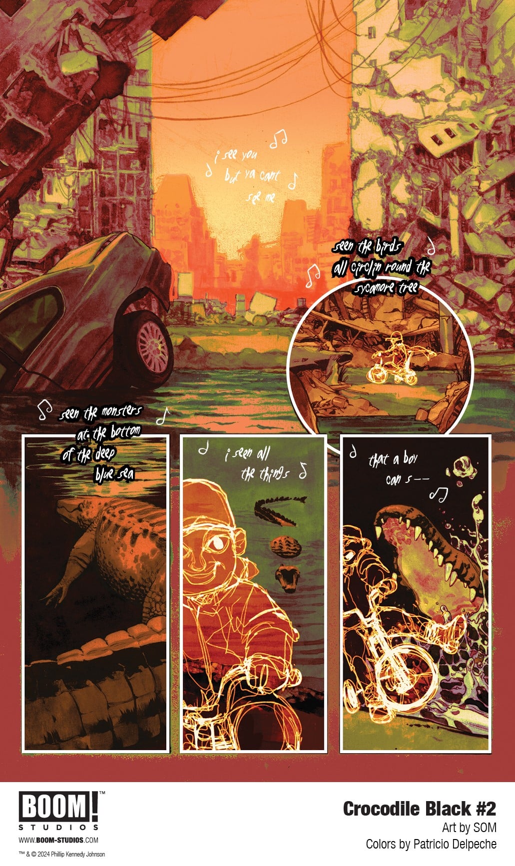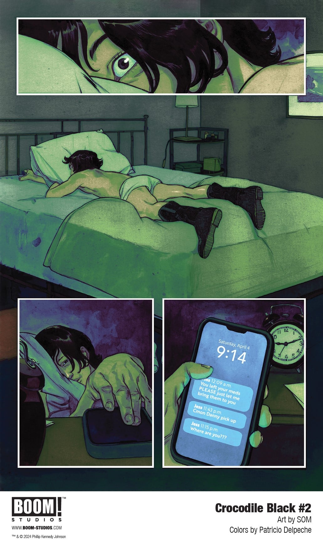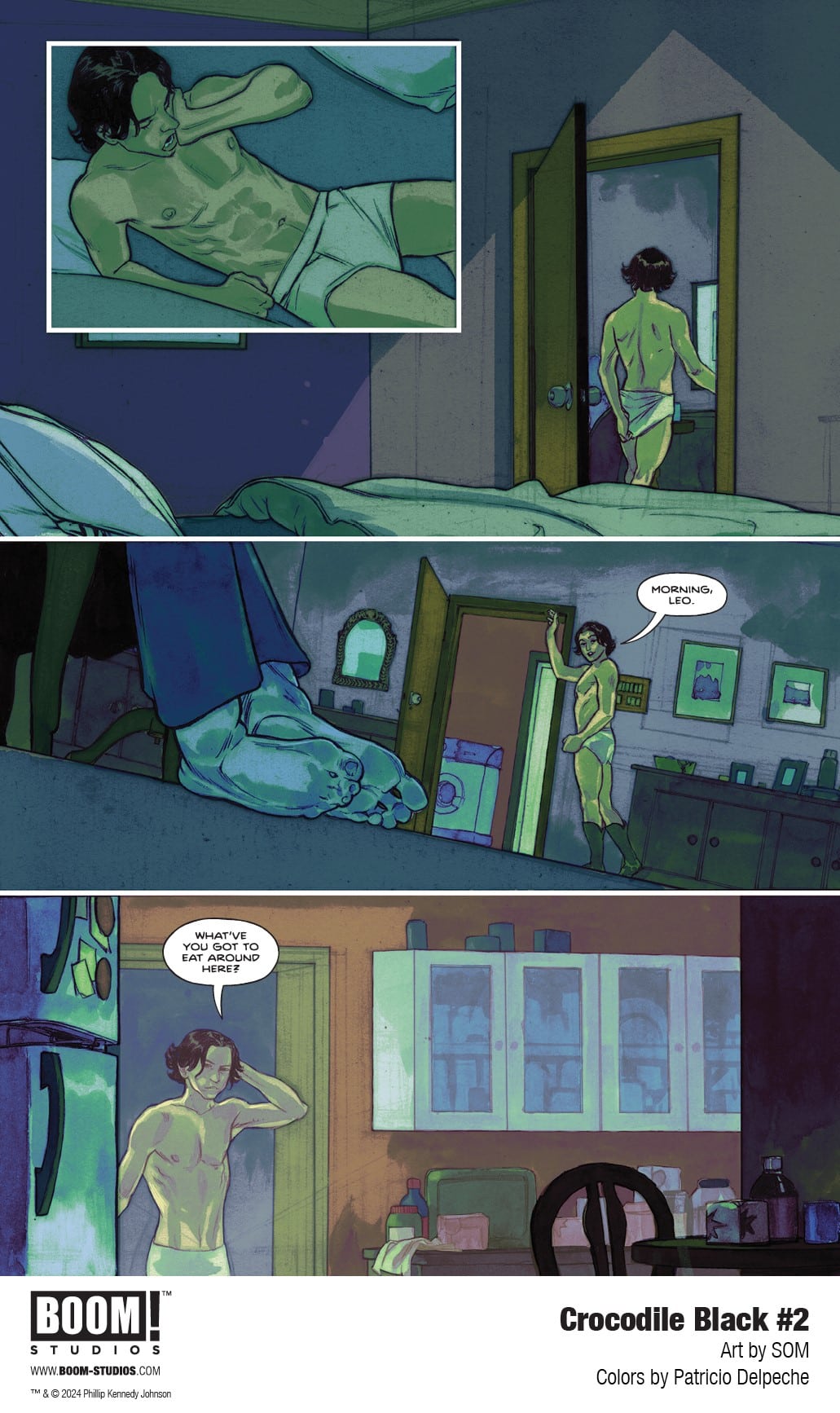 BOOM! Studios has revealed a first look at Crocodile Black #2, the next issue in the brand new series by writer Phillip Kennedy Johnson, artist SOM, colorist Patricio Delpeche, and letterer Becca Carey. Discover the iconic new noir lead in the macabre new thriller Crocodile Black on June 12, 2024.
