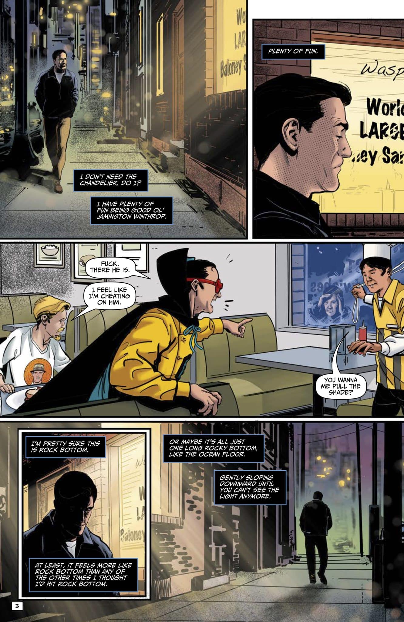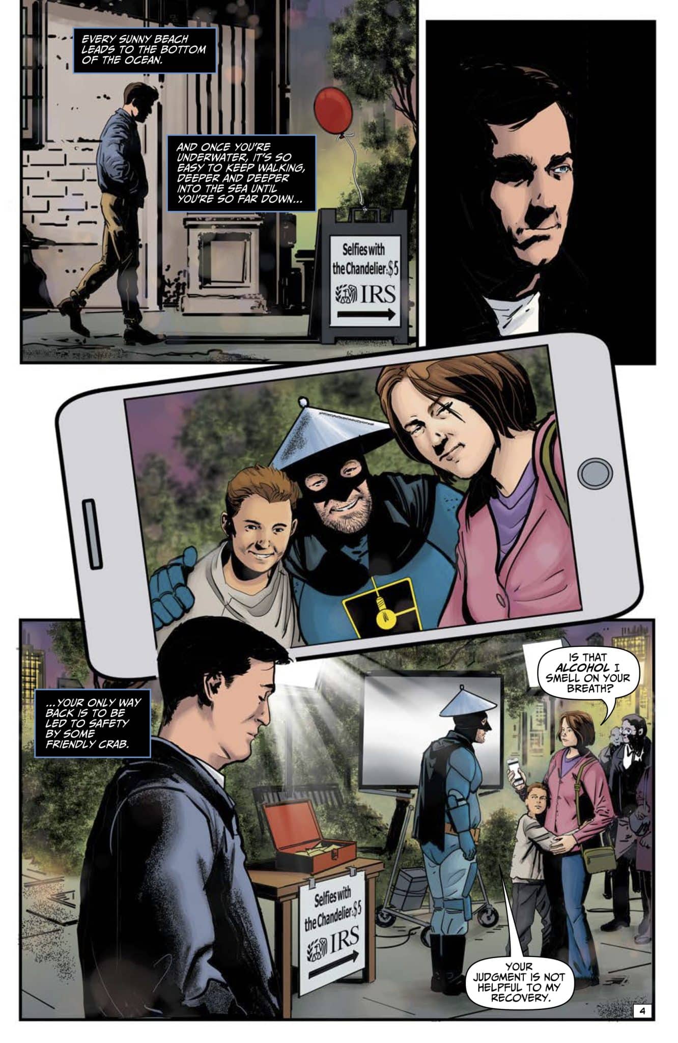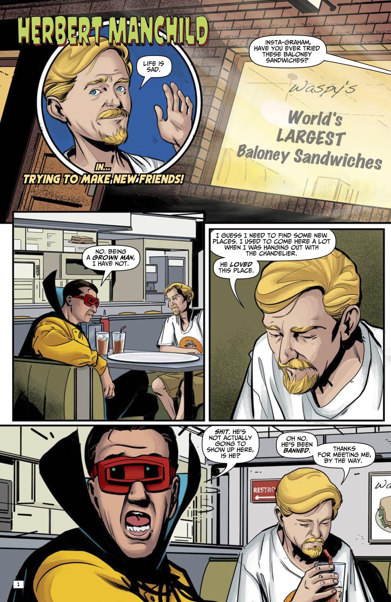 Continuing “One of—if not the—funniest superhero parodies I’ve ever read” (Comics Beat). Banned from his favorite baloney restaurant, retired crimefighter THE CHANDELIER seeks redemption at a sincere-seeming, paywalled website. In the Peculiar Islands, newly installed Governor (and former US President) AMAZING ADAMS faces off against Professor Octopus, a new character you’ve never heard of!