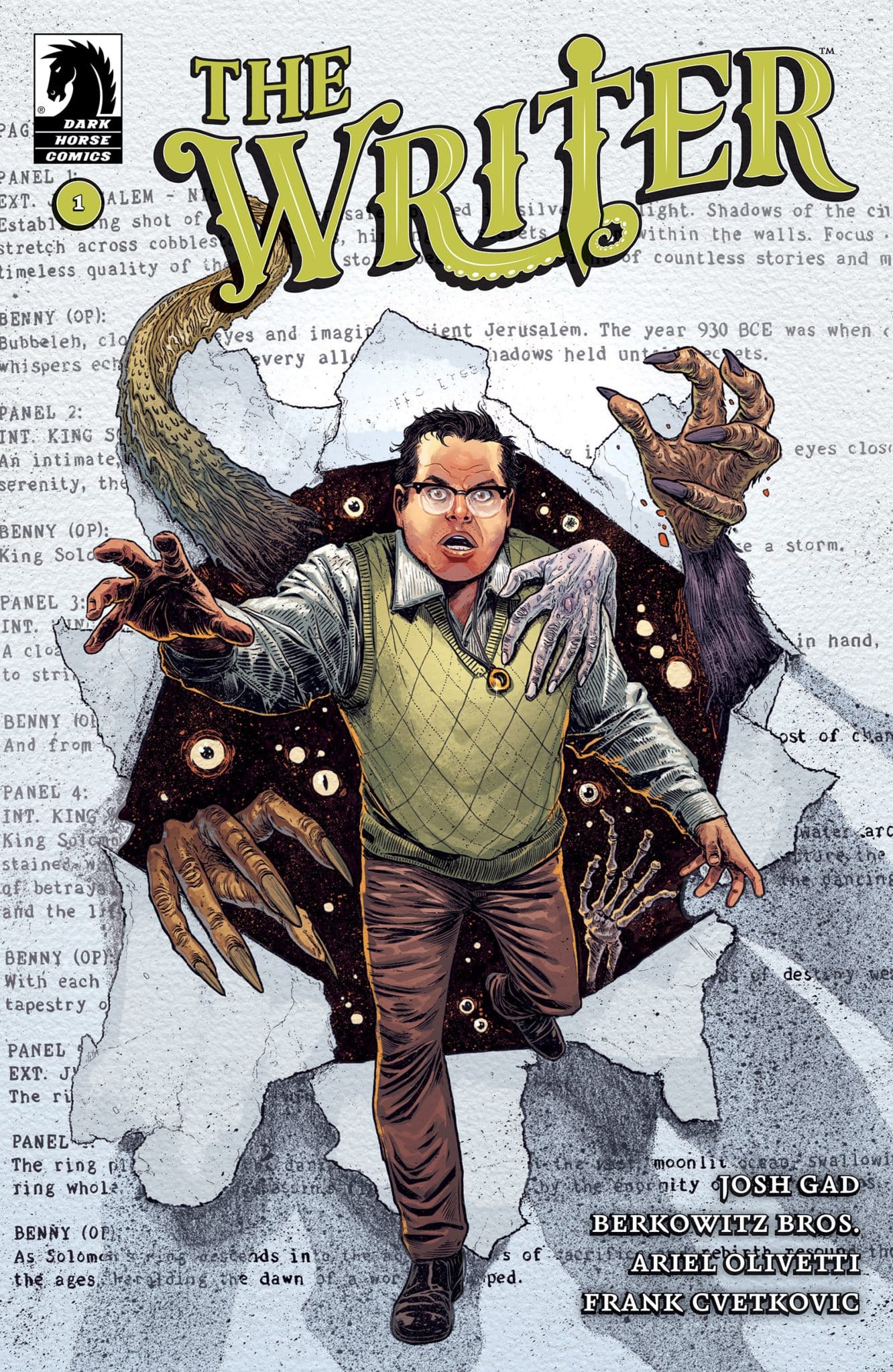 With a story by and written by Josh Grad, Ben Berkowitz, and, Max Berkowitz, The Writer #1 is a frustrating start of a comic that leaves you feeling like you missed something. The story starts innocently enough, talking about King Solomon and a magical ring lost through time. Flash to today, and we’re introduced to Stan who is teaching a class and dealing with antisemitism. What he doesn’t know is, he has a magical ring and also has powers like the Jewish folklore the Golem. Very little of that is explained as readers go with the flow for a start that feels like it’s missing big chunks of details. The main character is a Golem? The mother is this badass warrior? He eats a piece of paper to gain power and the villain just lets him? It all just sort of happens with little flow and little explanation.