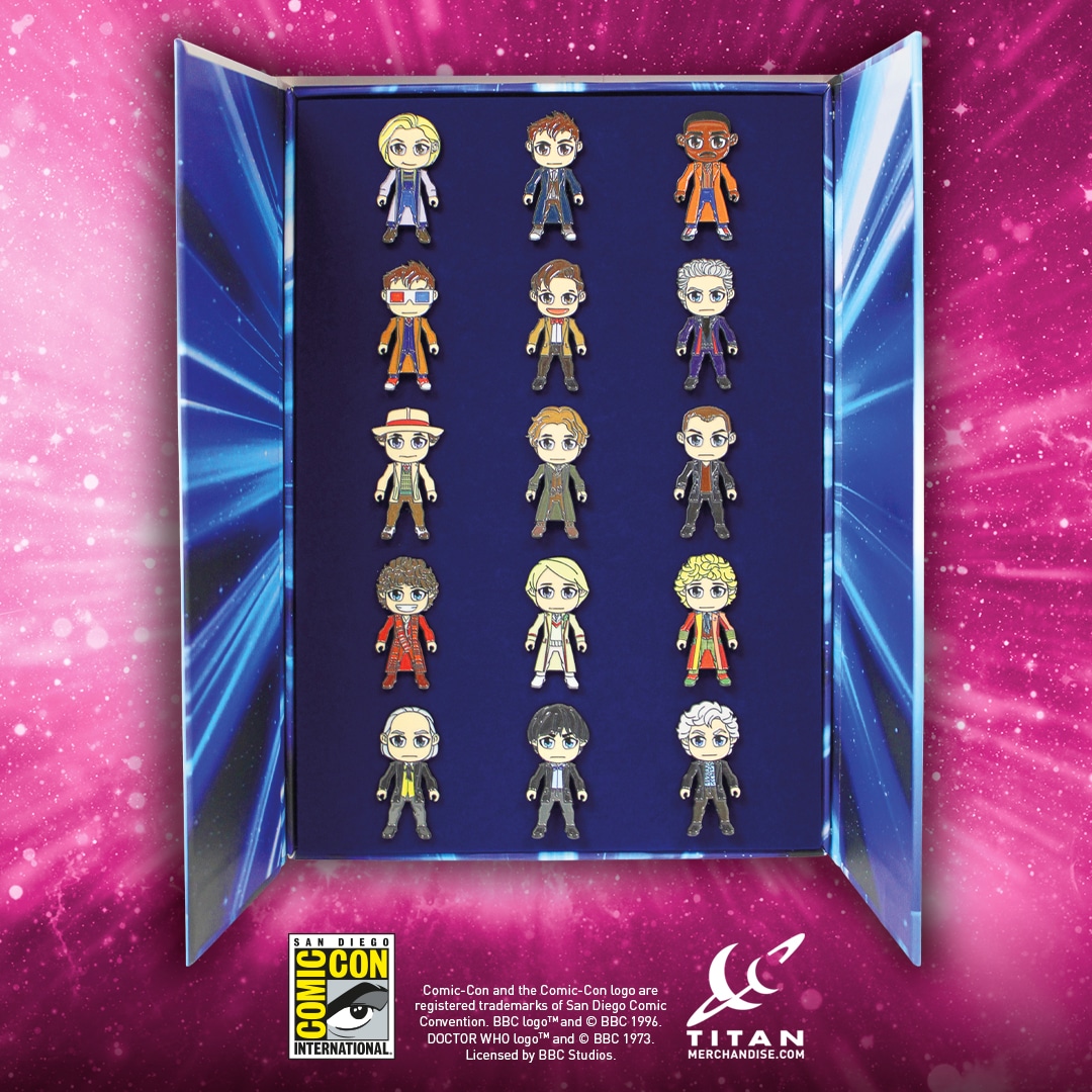 Titan Booth #5537 at Comic-Con 2024 is the only opportunity for global Doctor Who fans to buy this WORLD EXCLUSIVE Fifteen Piece Kawaii-style All Doctors Enamel Pin Collection! Please note: this beautiful, one-of-a-kind Kawaii-style All Doctors collection will only be available from Titan Booth #5537 from Preview Night (Wednesday July 24th). Numbers are EXTREMELY LIMITED. First come, first served!