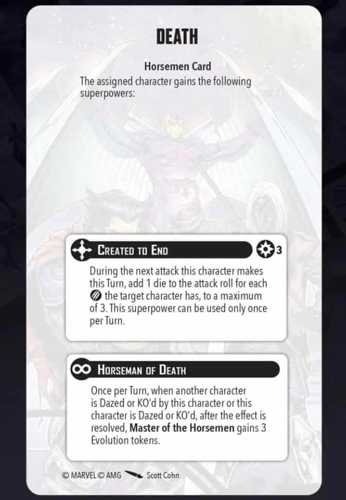 Apocalypse brings his own affiliation for the game. This ultimate encounter will pit you against Apocalypse and his Four Horsemen. Players will have a limited option for each of the Four Horsemen and to field all 4, you’ll need a minimum threat of 16. Archangel will be able to be either Death or Pestilence.