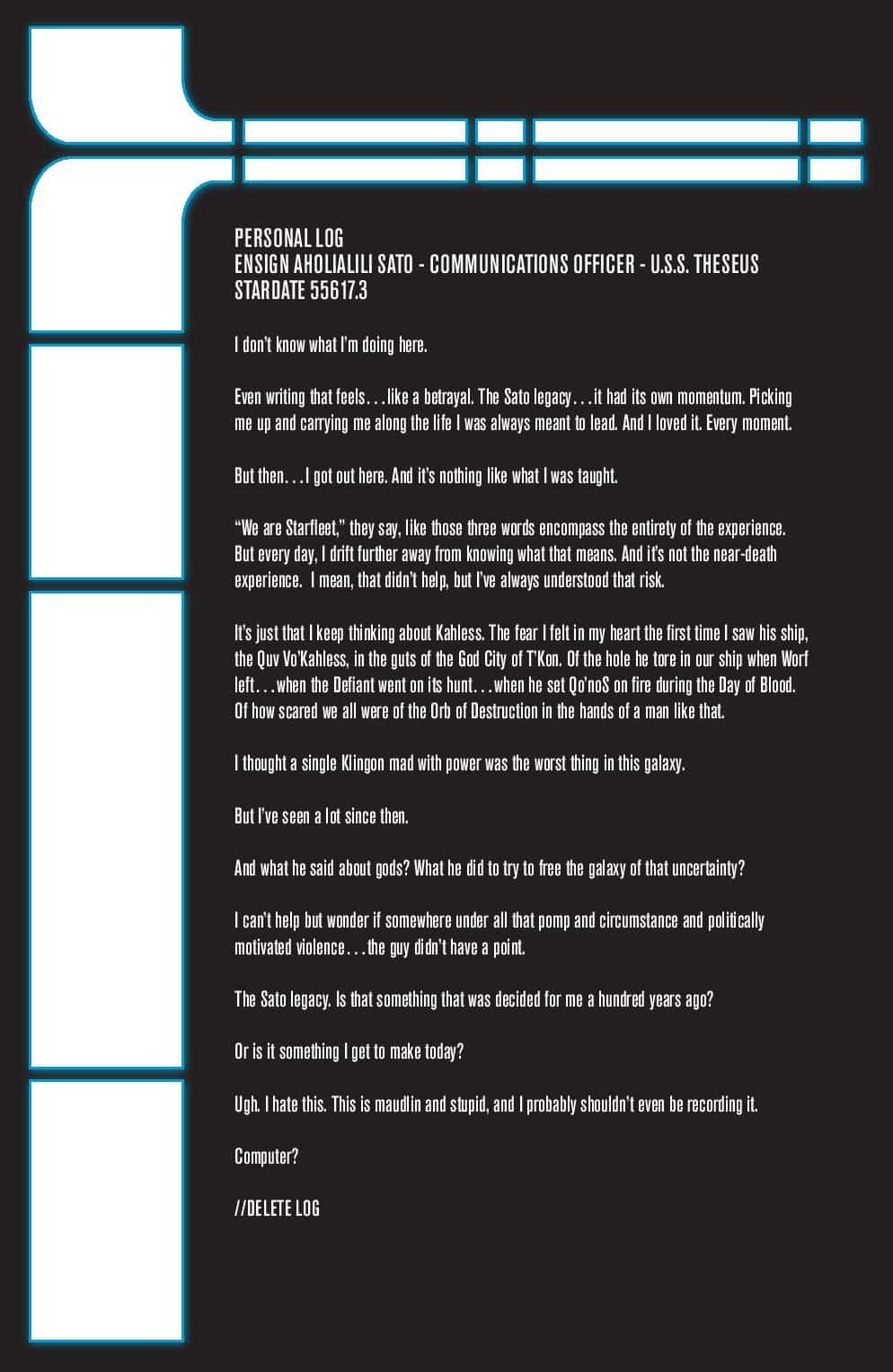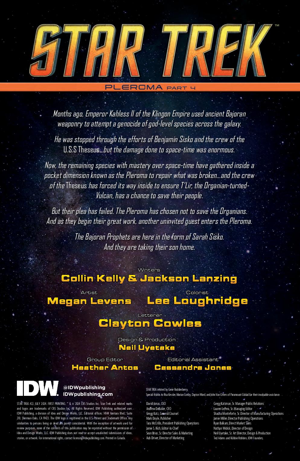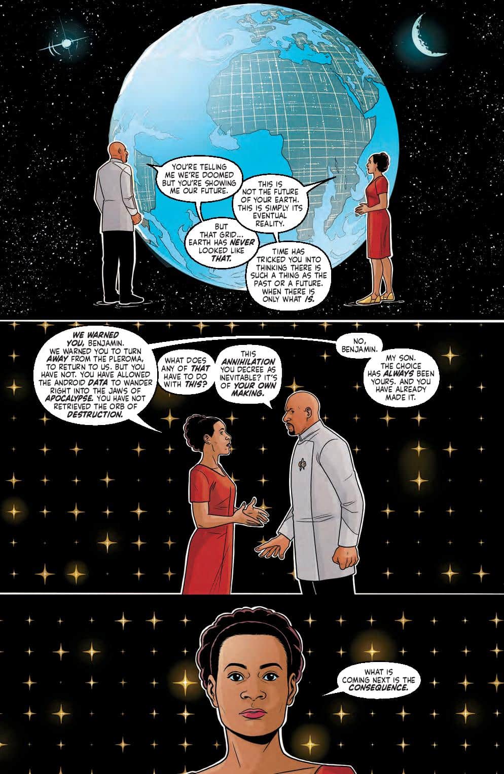 The meeting of the gods at the Pleroma continues as Captain Sisko confronts his celestial mother in the very fabric of space and time! Why was he called home to help in the fight against Kahless, only to be forbidden from attempting to protect the universe from the brutal aftermath? Meanwhile, Beverly Crusher boldly outmaneuvers the gods for an emotional reunion, and Ensign Lily Sato, torn between her best friend and feelings of disillusionment with Starfleet, contemplates a decision that could change everything with the push of a button…