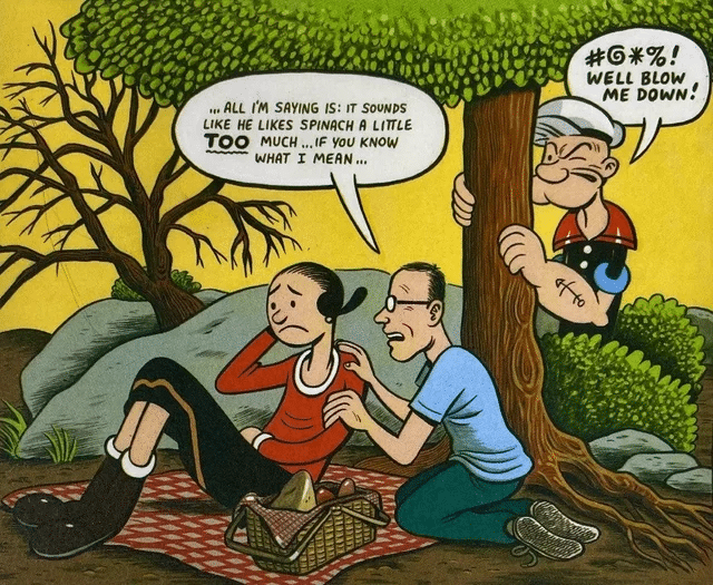Peep Show #15 is a weird, vulnerable, and impeccably rendered swan song to the comics creator, Joe Matt. Matt wasn’t afraid to spend an entire comic making himself the butt of the joke and putting his idiosyncrasies on display. I enjoyed his interactions with his new friend Brian who reminds a lot of us book and comic hoarders to actually read and savor the gems in our collection instead of letting them pile up. For all his proclivities, Joe Matt loved comics, especially classic comic strips, with a depth and passion that was transferred over to his meticulous work so it’s fitting that the front cover of the book shows him reading a comic on the toilet and the back cover is him flirting with Olive Oyl from Popeye.