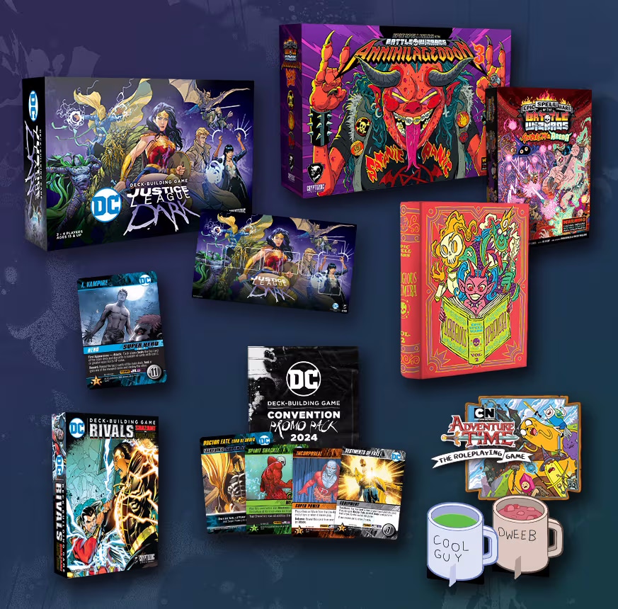 At Booth #801, Cryptozoic will go big on the DC Building Game series, led by recent releases Justice League Dark and Rivals — Shazam vs. Black Adam, plus Crossover Collection 2, Crisis Collection 2, and Rebirth One-Shot Packs, all three of which are releasing the first day of Gen Con. DC DBG fans can look forward to limited Kickstarter Exclusive copies of some titles, including Flashpoint and Legion of Doom. Fans can also get the exclusive Convention Promo Pack 2024, which includes four new cards, and an exclusive Justice League Dark Playmat. During the show, Cryptozoic will reveal the next DC Deck-Building Game title.
