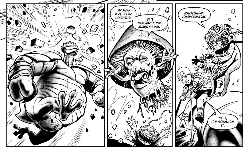 But “Modded” (and this article) isn’t some anti-video game screed, but also a love letter to how they provide freedom, escapism, and fun from a world that’s becoming similar to a post-apocalyptic one although sadly fetish wear isn’t daily wear just yet. Kieron Gillen and Nahuel Lopez explore this through the concept of “Blue sky”, which gives Lopez an opportunity to show what it’s like playing Super Monkey Ball (That’s a game I wouldn’t mind revisiting.) whilst tripping. Blue skies are also rare in the world of “Modded” because they’re like a concentrated shot of hope and optimism in a world of conflict. To take things to the real world for a second, blue sky is a reminder of a world where you didn’t have to care about bills or job performance and just thought about getting the next star in Super Mario 64 or building the ultimate University of Tennessee dynasty in NCAA Football. (Someone please get me a PS5 so I can play the new one that came out.) On the storytelling side, Gillen and Lopez free up the narrative in “Modded” Chapter 14 where Tommy Zero and Fringe race under the influence of Blue Sky. There’s speed lines galore, blocks to smash, a disturbingly realistic mushroom, and one hell of a comedown. Sadly, during this comedown, Susan steals Fluffbumble from Fringe snapping her back to reality.