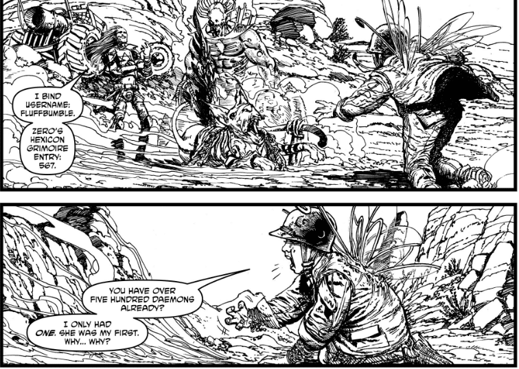 Fringe actually does win some battles and competitions for better or worse throughout the run of “Modded”, but she’s mostly treated like a novelty figure, who just wants to put a pretty hat on her daemon instead of a phallic minigun or something out of Preacher. (Apparently, it’s still a must read in the post-apocalyptic world.) Even her speaking patterns are roasted by the daemonatrixes of the Abyss because she’s kind and doesn’t swear, and they drop f- or c-bombs almost every other word although there’s one hilarious scene when a member of Tommy Zero’s crew says they’re just putting on appearances. Gillen’s dialogue nails the way hardcore gamers speak with a toxic blend of jargon, profanity, misogyny, and homophobia, and this bad behavior extends to some of the daemons to with Tanky Andov reminding you that this is an Avatar book by graphically “tea-bagging” another player to Fringe’s chagrin. The middle half of “Modded” shows the addictive nature of video games, and how it’s easy to consumed with being the best/winning and let friendships and relationships fall to the wayside as Fringe and Susan drift apart.