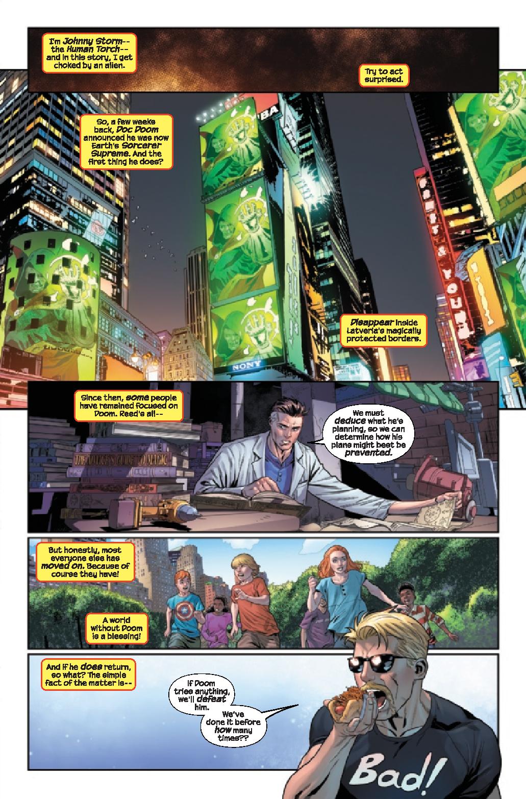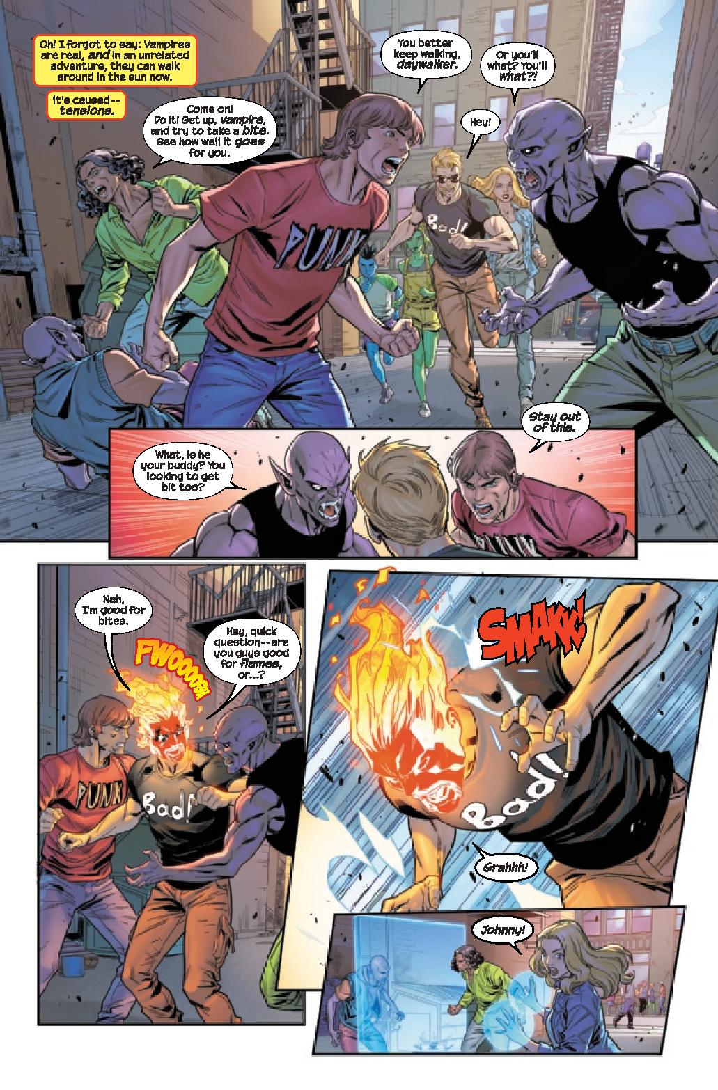 The world is recovering from Blood Hunt, and Johnny and Sue take Jo and Nicki to NYC for a bit of a break… …but when a cosmic incident from outer space threatens forty percent of the planet, the whole team is forced to meet in New York and get to the bottom of what’s really going on! The Fantastic Four will need teamwork, cleverness and an old vehicle dug out of storage to save the world…plus some super-science! And that’s before the aliens show up! Johnny Storm gets in over his head in this Johnny-narrated issue!