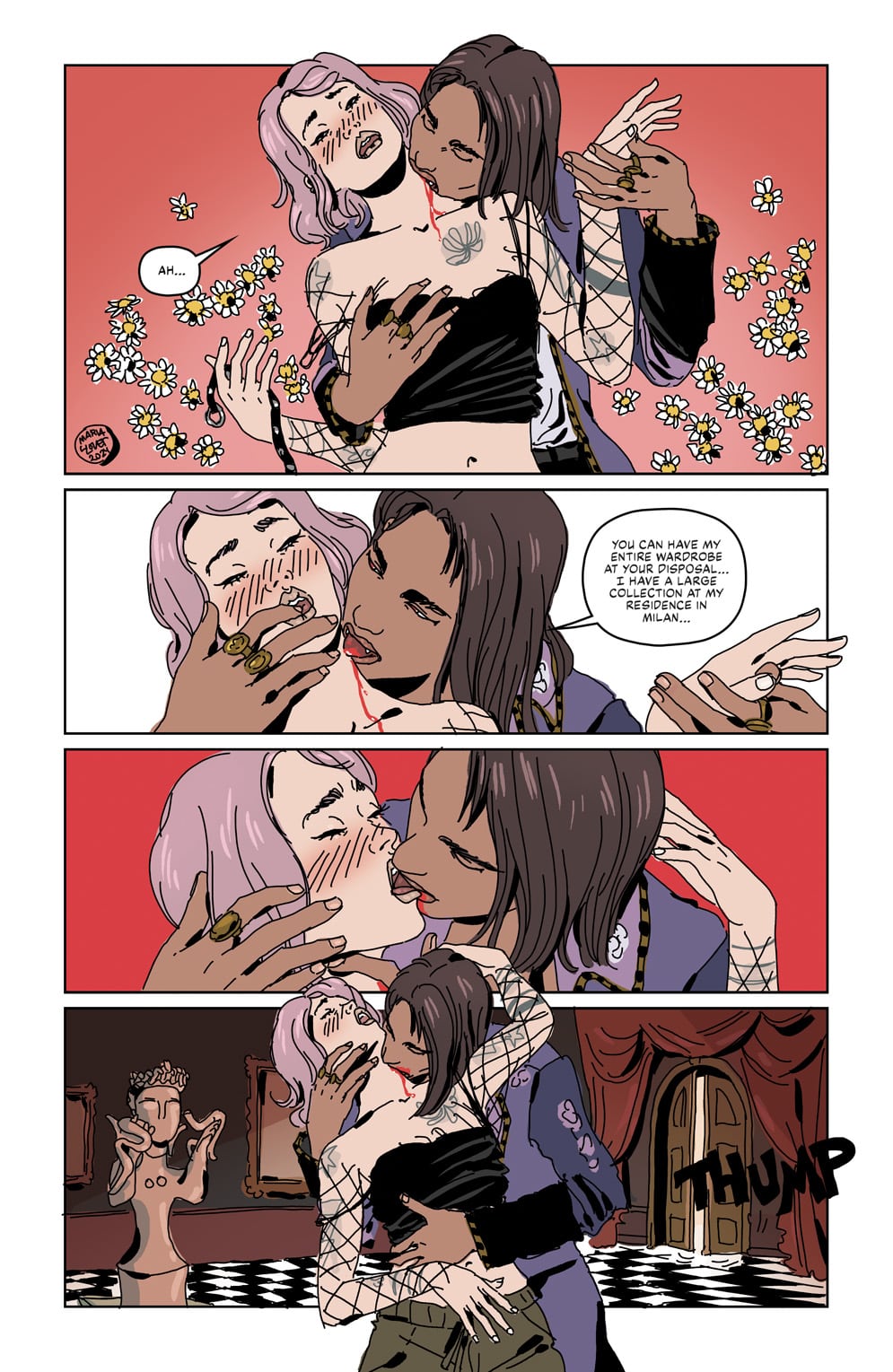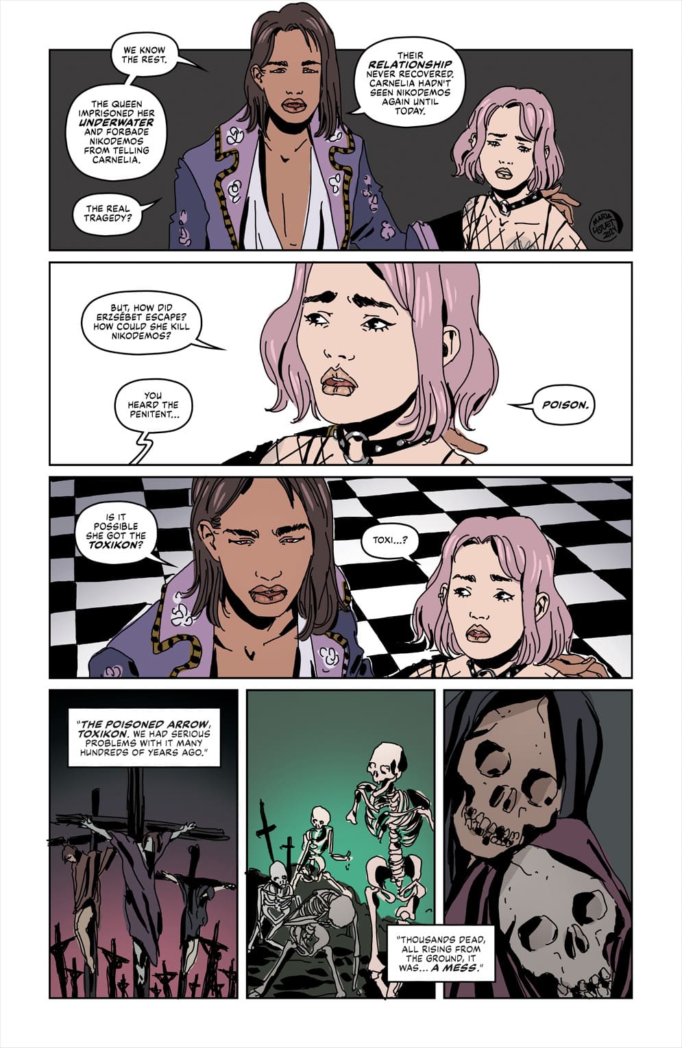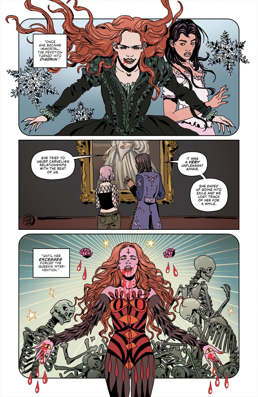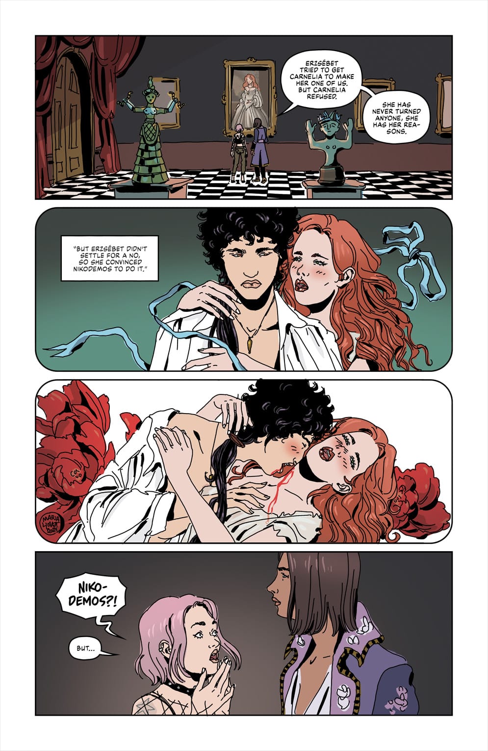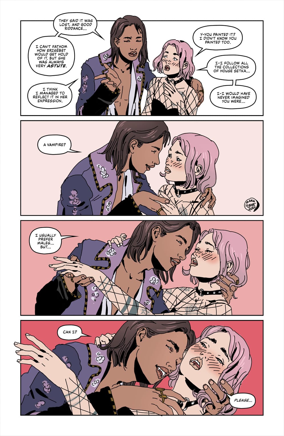 “Vengeance blooms in their veins.” Setka tells Anna about Erzsébet’s past: Erzébet was a very devoted mortal lover of Carnelia’s, but when she refused to turn her into a vampire, she tricked Nikodemos into doing it himself, later descending into a spiral of blood and madness. Carnelia and Anna attend a supernatural party hosted by the sea creatures known as The Triplets, to try to find out where Erzébet is, but it turns out she’s at the party herself…