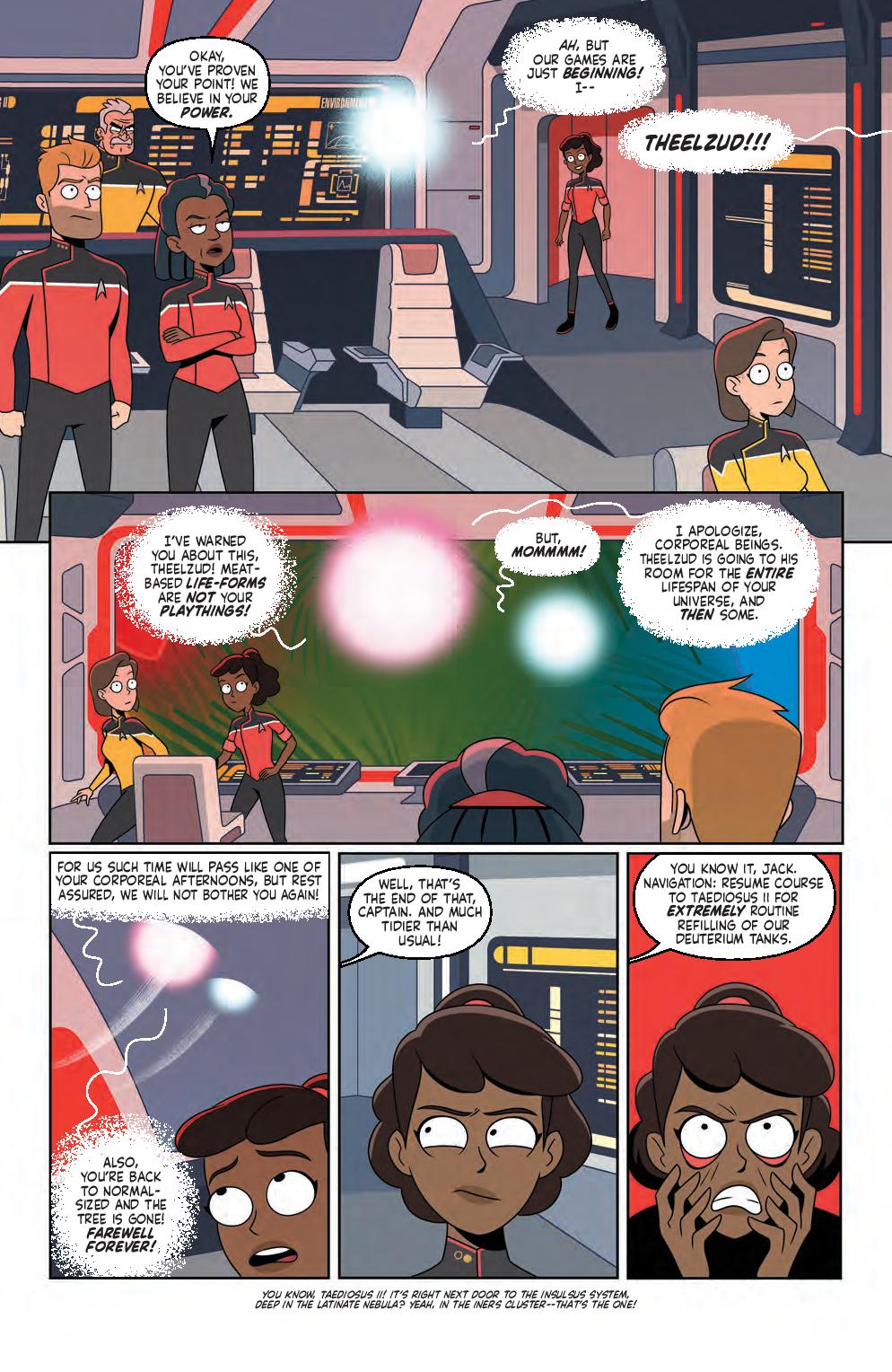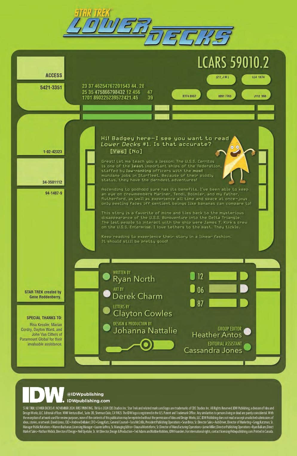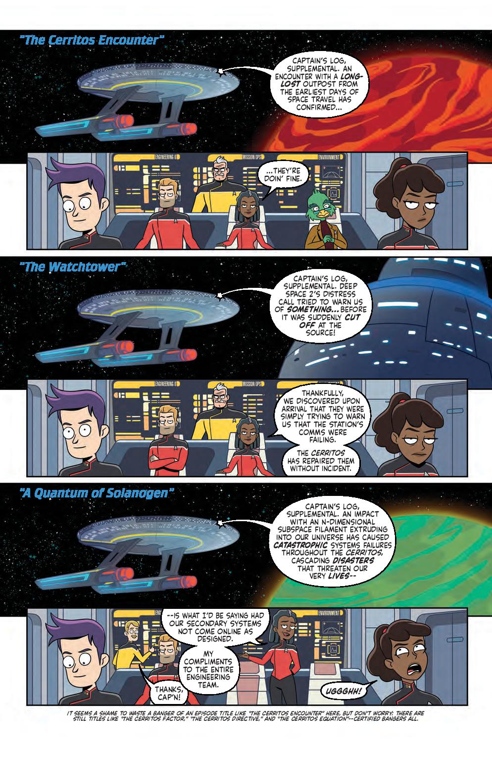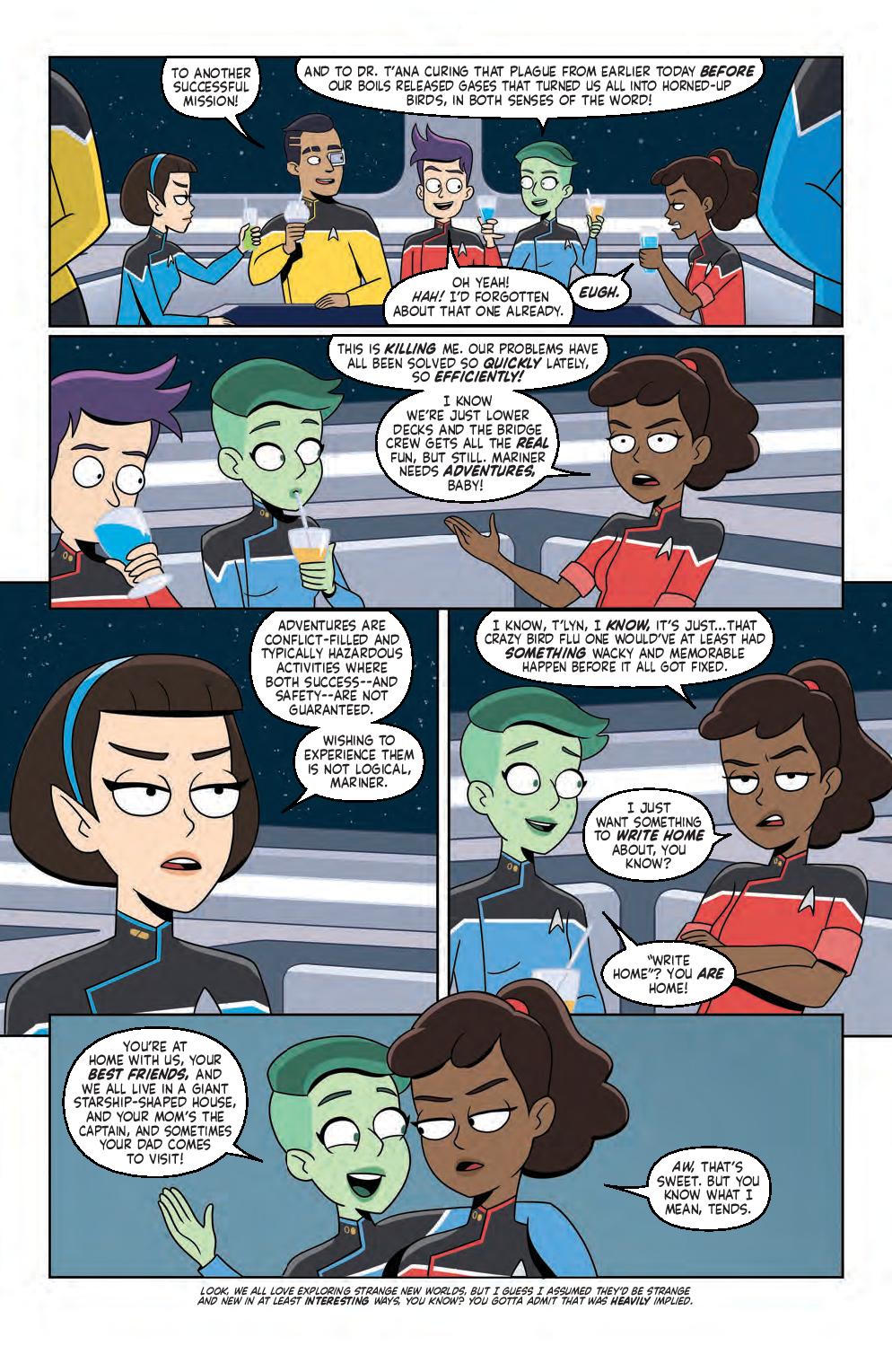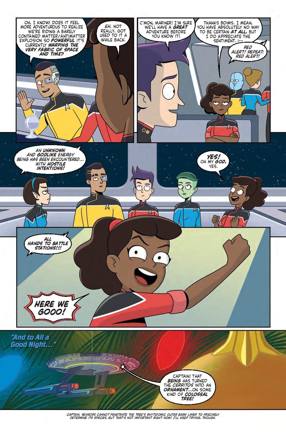 Hot off their Eisner nomination for Lower Decks tie-in Shax’s Best Day, stellar duo Ryan North and Derek Charm are kicking off a brand-new ongoing series that’s a big fun adventure on a big fun ship… wherein Dr. T’Ana saves the crew from a virulent, purple-boiled disease that is sure to- Wait, no, everyone’s cured pretty quickly, actually. Okay… wherein Deep Space 2’s distress call is mysteriously cut off and the crew has to- Wait, nope, they just needed some help resetting their comms systems. All right, wherein Mariner gets so totally frustrated with the lack of thrills aboard the Cerritos that she drags her friends into a holodeck adventure that would definitely kill them in reality! Should totally provide them all with a sense of purpose and well-being, right? Right. Or at least it would have. If the U.S.S. Bonaventure hadn’t shown back up from the Delta Triangle to provide them with a real challenge. It’s time to explore a ghost ship, baby!
