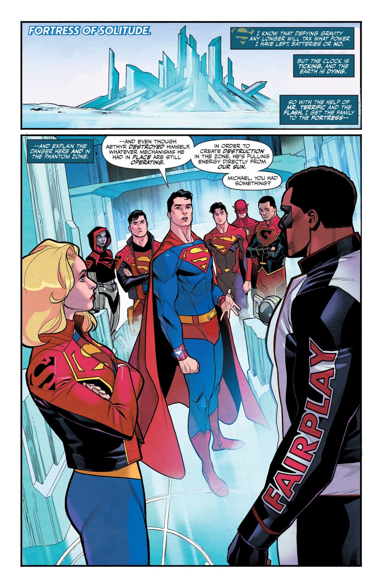 Two worlds in peril; only one can be saved. Teaming with his fellow Justice Leaguer, Mr. Terrific, to defend against Aethyr’s deadly machinations, the Man of Steel is left on the defensive and out of options. Superman must choose which realm to save: Earth or the Phantom Zone! Plus, Supergirl falls under the spell of Koncept!
