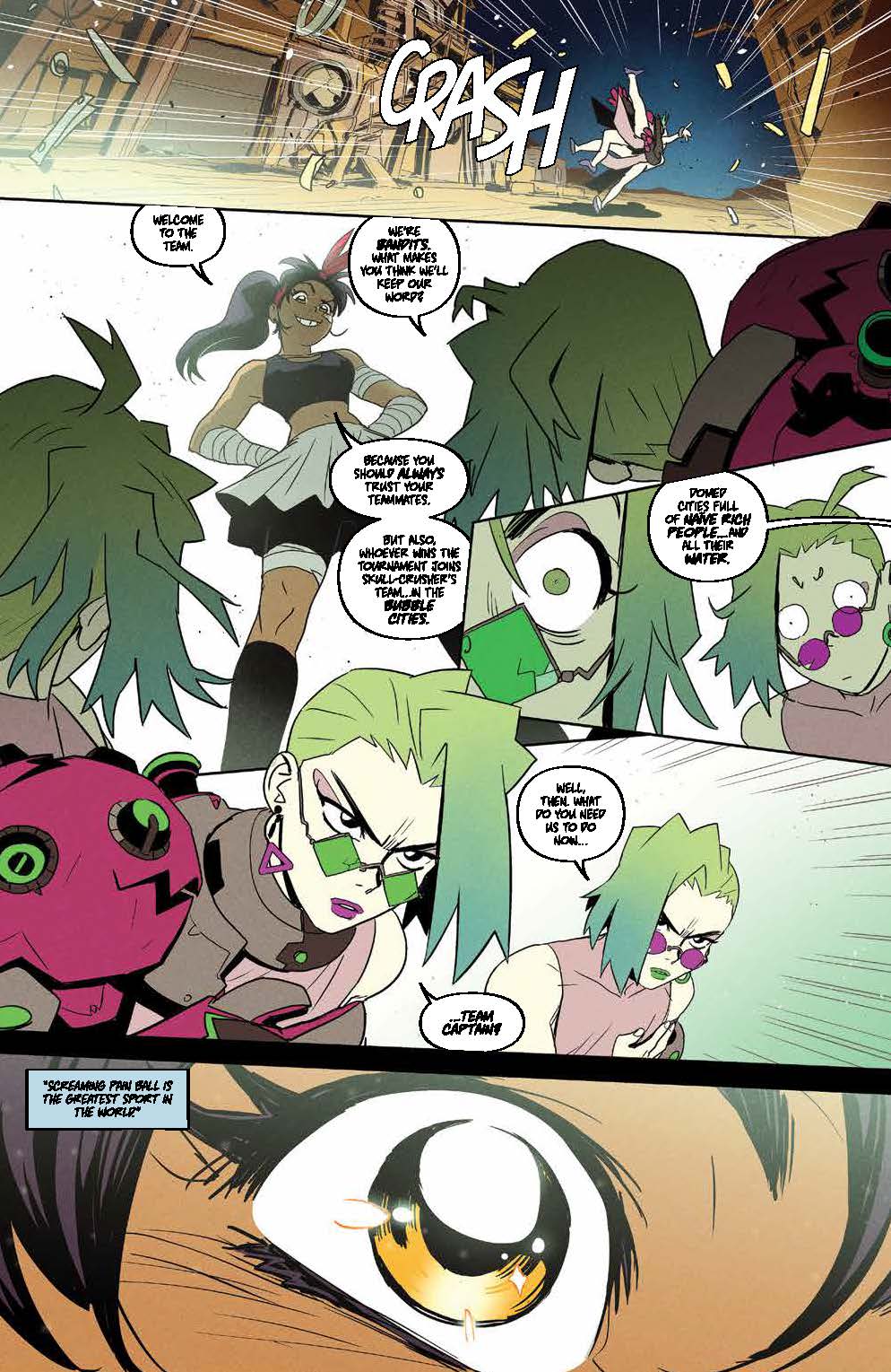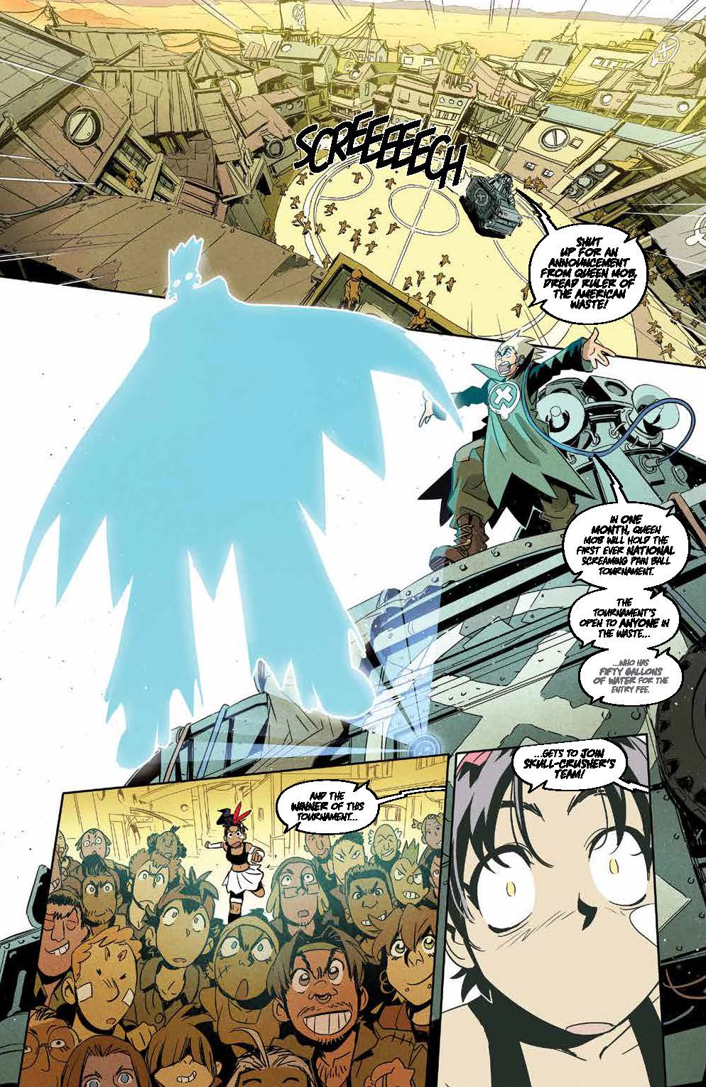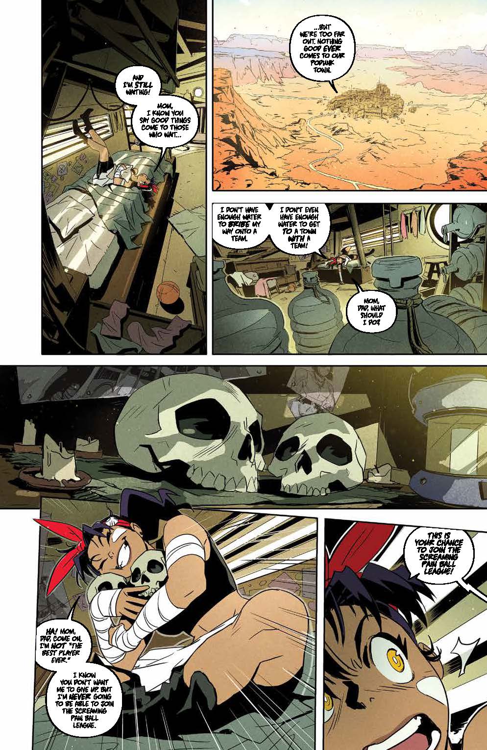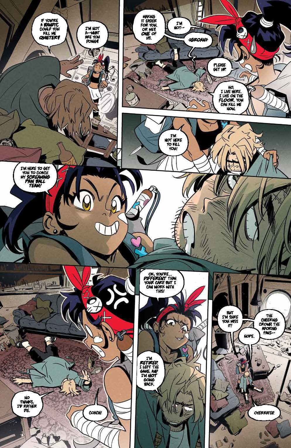 Teenage Trini will do anything to compete in her favorite sport, Screaming Pain Ball, alongside her longtime hero Skull-Crusher, and a gaggle of misfits is just what she needs to cross the American wastes and battle in Queen Mob’s deadly tournament. With Trini’s dreams of being just like Skull-Crusher on the line, what will it take to win a coveted spot on their team?