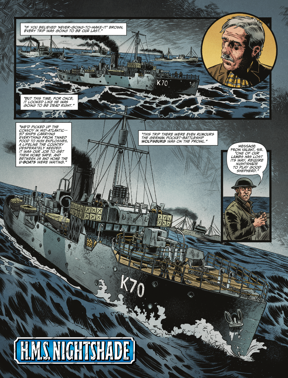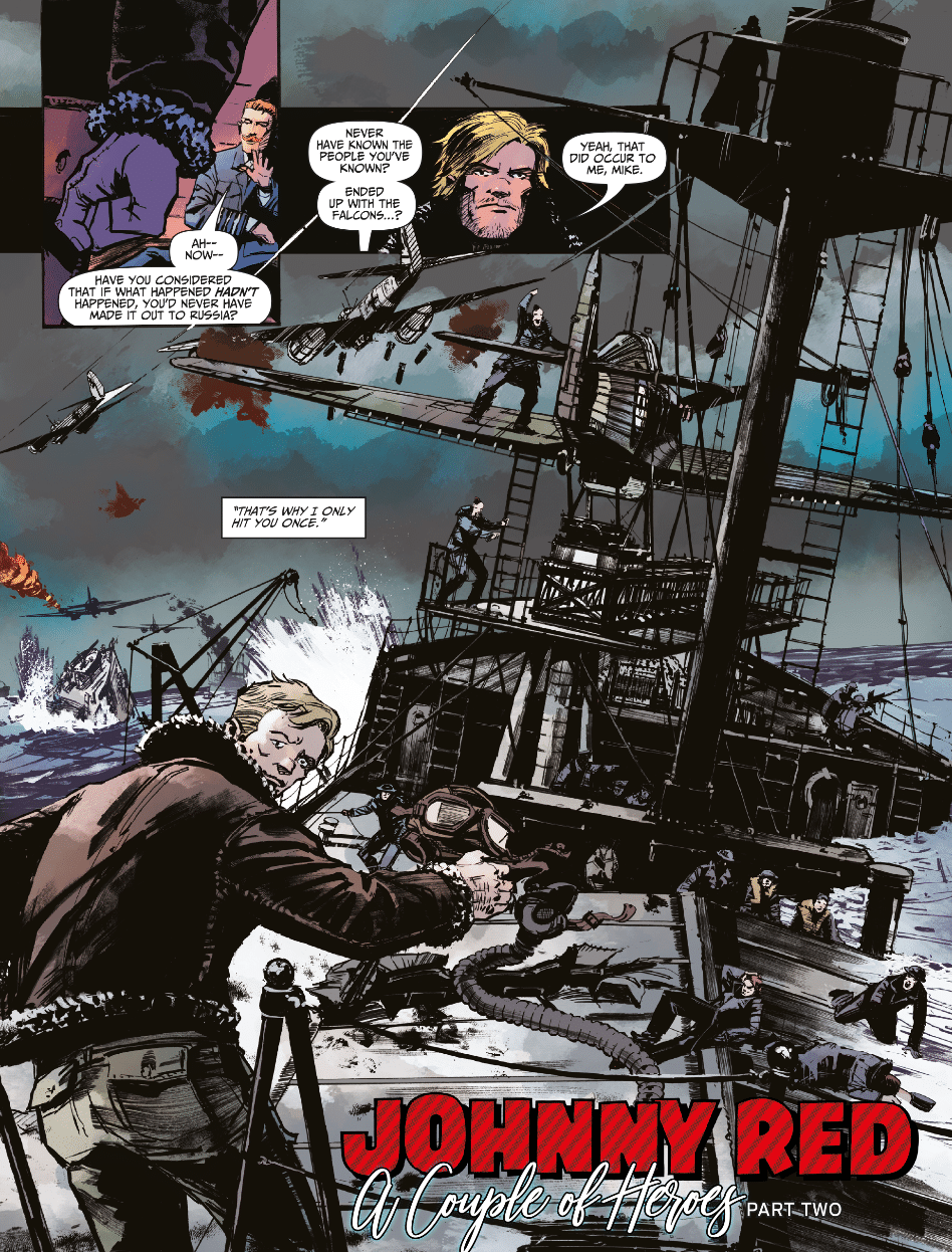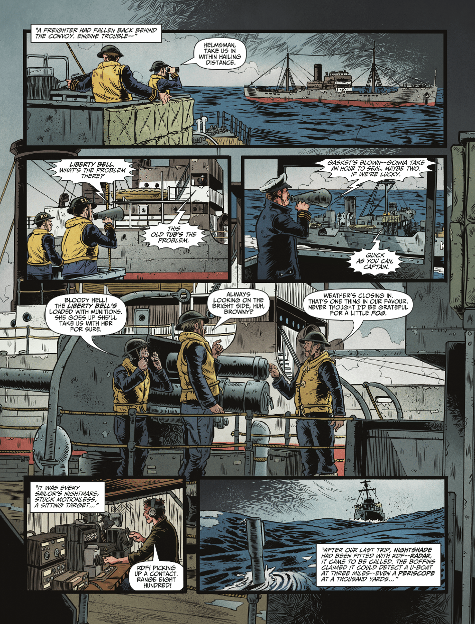 Garth Ennis and Keith Burns’ final Johnny Red story continues, as Johnny reunites with the pilot who got him kicked out of the RAF at the very beginning of his aviation career. Now a high-ranking officer, he requests Johnny’s help on a dangerous mission, and failure will irrevocably determine the war’s outcome, and foreshadow how wars are fought throughout the 20th century. This issue also features John Wagner and Dan Cornwell returning for another adventure featuring the crew of the HMS Nightshade, as Nightshade must protect a convoy from overwhelming Axis forces, but at what cost to themselves?