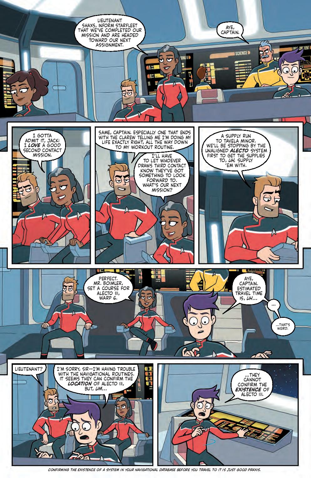 The crew of the USS Cerritos have just received their personality guidance reports from the counselors of the planet Clarew, and Rutherford feels guilty he’s not engineering at a higher capacity with his implants. He should be operating above 134 percent nominal at least. The Cerritos’ next mission is a supply run to Tavela Minor, but they first need to stop by the Alecto system to get some supplies to, uh, supply them with. However, just before they warp, they see the Alecto system isn’t only missing; it doesn’t exist. Like at all. Now they have a space mystery at hand: What could cause a whole star system to disappear?