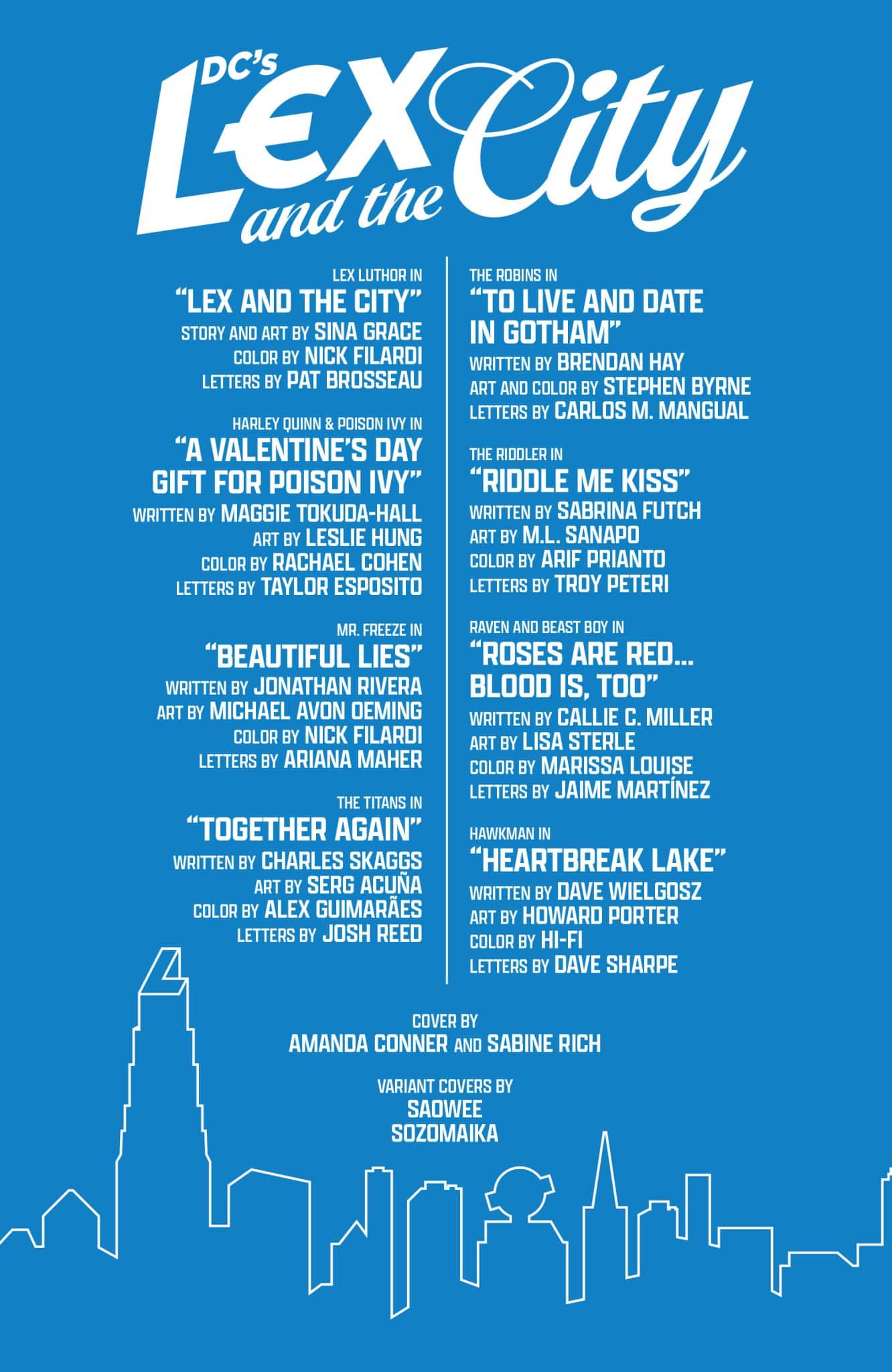 AS SUPERMAN FLEW AWAY YET AGAIN, I HAD TO WONDER…WAS I TRYING TO DESTROY HIM, OR WAS HE DESTROYING ME? It’s Valentine’s Day, which means that love and heartbreak are sweeping every city in the DCU! This anthology collects eight stories of heroes and villains looking for love in the big city (which practically feels like its own character!). Lex Luthor laments over the one that got away–the big, ever-elusive Metropolitan man, Superman! Raven and Beast Boy embark on a romantic scavenger hunt across San Francisco (which just might be a trap)! And Damian Wayne runs a dating-advice gauntlet through Gotham City, organized by none other than the dating master himself, Tim Drake! Gather your gal pals, pour yourself a cosmo, and hit your nearest comic shop–DC’S LEX & THE CITY is coming this January!