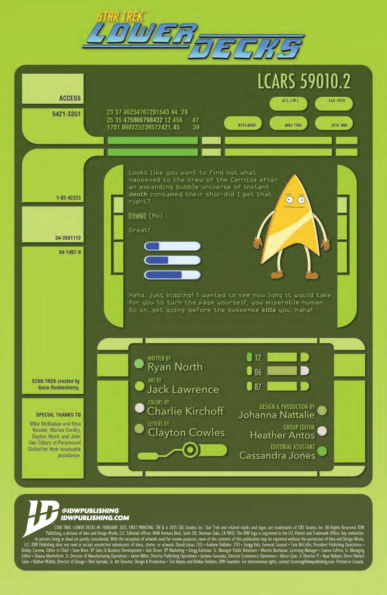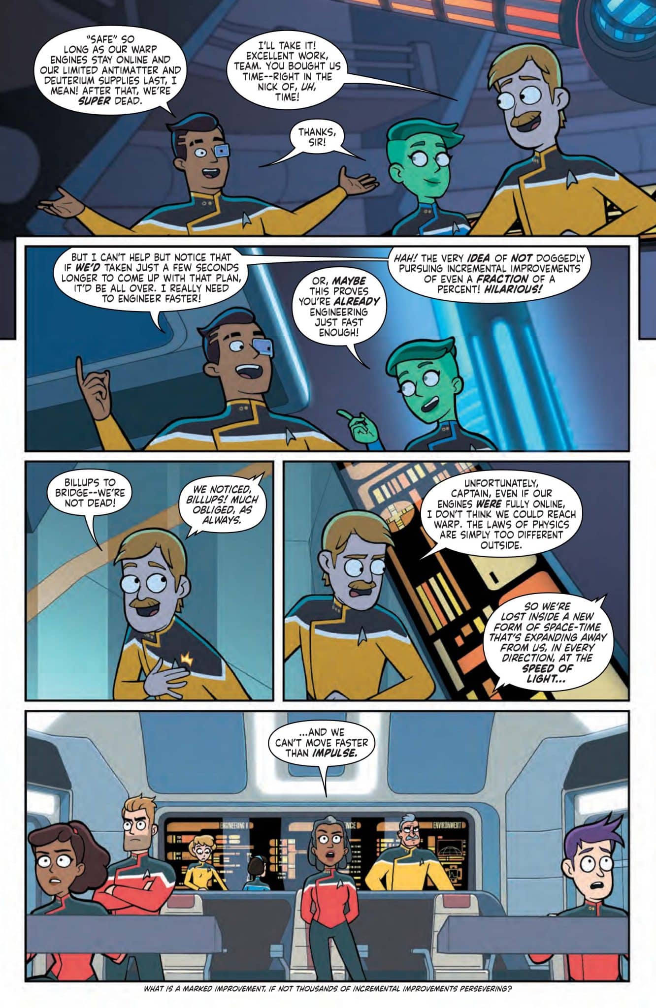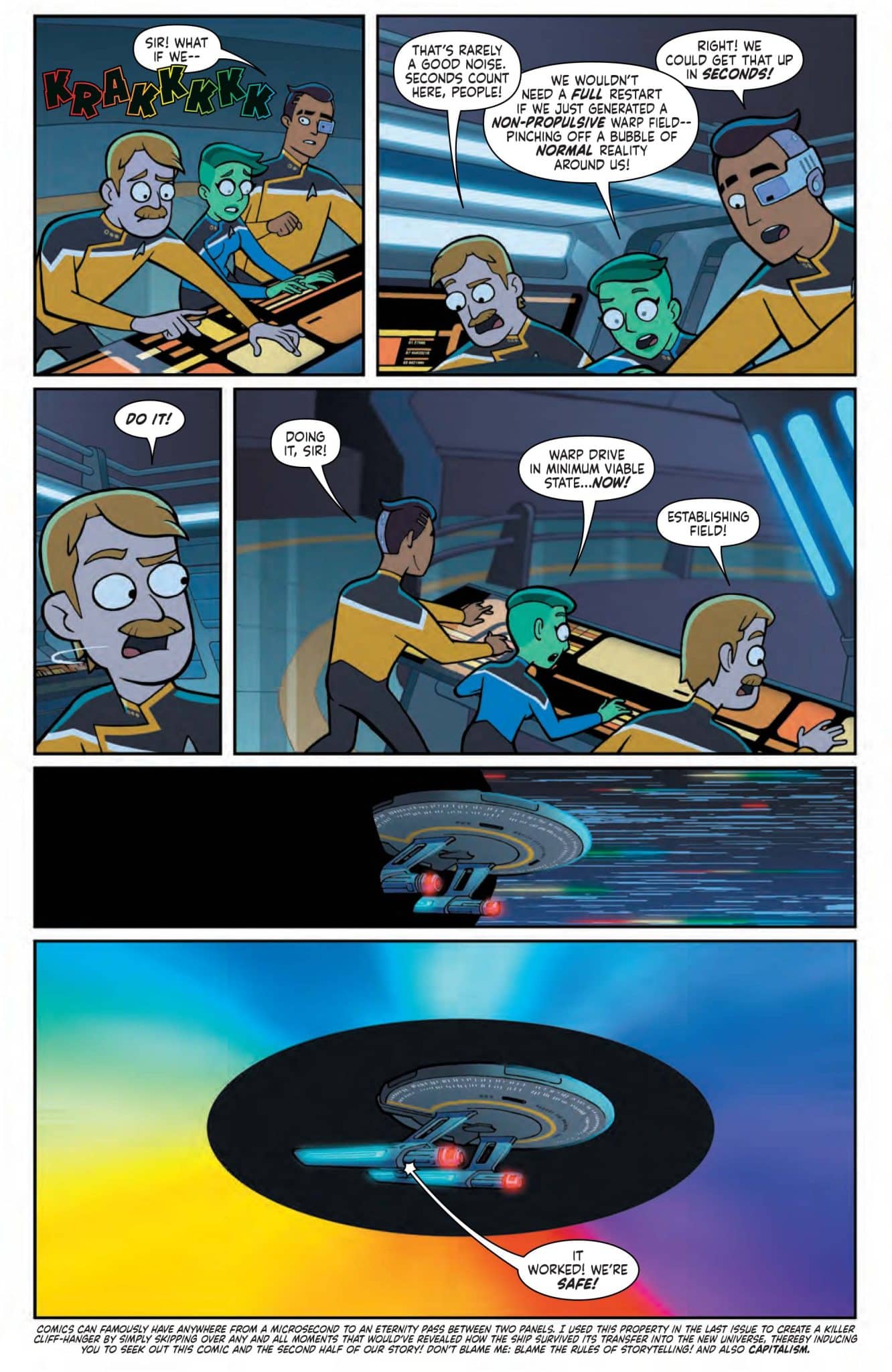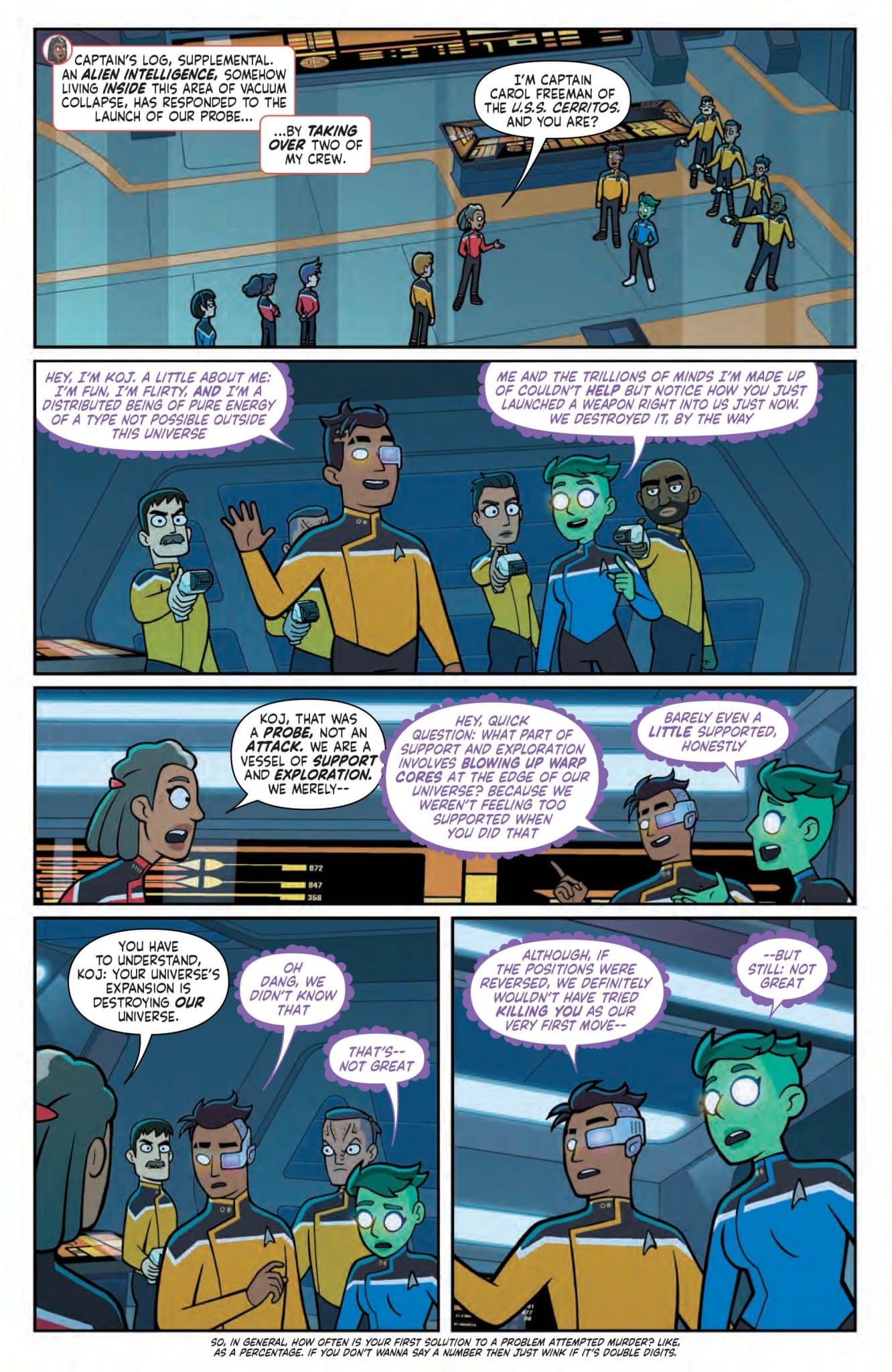Rutherford to bridge. We’re not dead! However, after escaping a vacuum collapse of the Alecto system, the U.S.S. Cerritos is lost inside a new space-time that’s expanding away from us in every direction at the speed of light. To make matters worse, an alien intelligence made of pure energy has possessed Tendi and my bodies, shunting our consciousnesses into the ship’s computer. While it’s a fun, flirty energy, we’d very much like our bodies back so we can pop the expanding time bubble and save our universe!