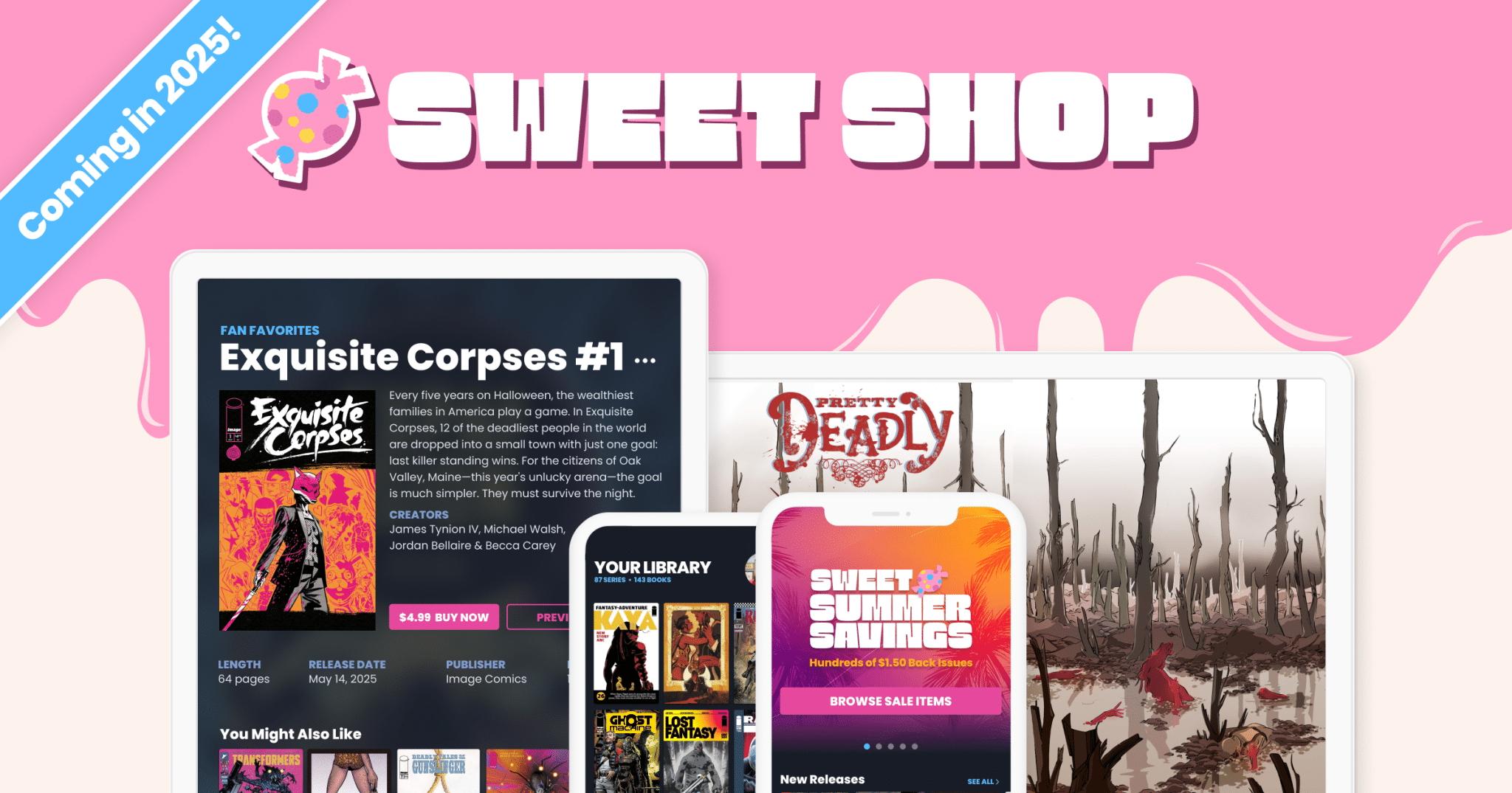 Sweet Shop users will be able to read the library of comics on both Apple and Android devices and Manga and North American comics alike will be available on the app. Fans will be able to confidently browse and buy—either in-app or in DRM-free download format—from a variety of Image titles, available globally, with few exceptions.