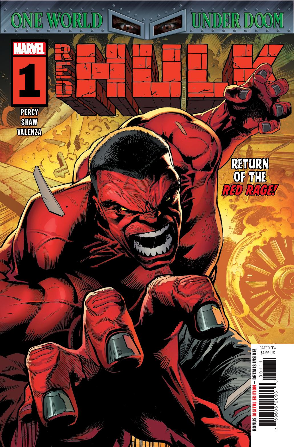 Thunderbolt Ross – in a cell deep below the ground – is a prisoner of Doctor Doom And he is not alone. Brilliant military, criminal and political minds have been gathered against their will in a prison complex that serves as a “Think Tank” to help carry out Doom’s plan for global domination. But the Red Hulk has other plans! Guest starring Machine Man and Deathlok! Red Hulk #1 so far is the most surprising debut of “One World Under Doom.”