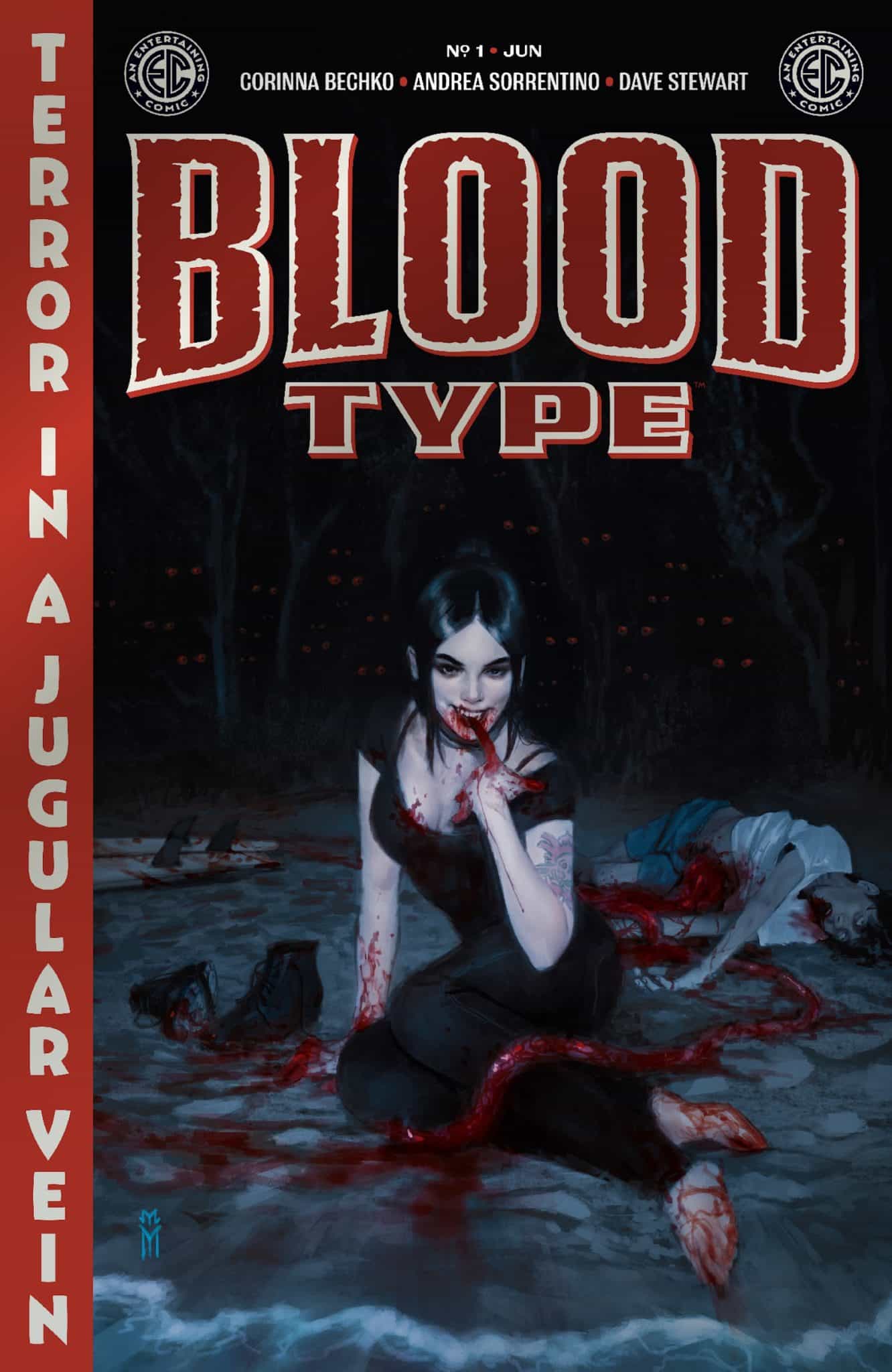 OUT OF THE PAGES OF EPITAPHS FROM THE ABYSS . . . A MONSTROUS NEW EC COMICS MILESTONE RISES FROM THE GRAVE THIS JUNE! Oni Press and William M. Gaines Agent, Inc. present the first look inside the next history-making chapter of EC Comics’ blockbuster resurrection with Blood Type #1 – the FIRST ISSUE of EC’S FIRST-EVER SERIALIZED HORROR SPECTACLE from Hugo Award-nominated writer Corinna Bechko and Eisner Award-winning artist Andrea Sorrentino! Rising from the pages of her first appearance in last fall’s Epitaphs From the Abyss #3, EC’s own blood-splattered, bon vivant vampire will be making history as the first character to claw her way out of an iconic EC Comics short story . . . and into the first-ever standalone, serialized horror series from the most notorious name in terror!
