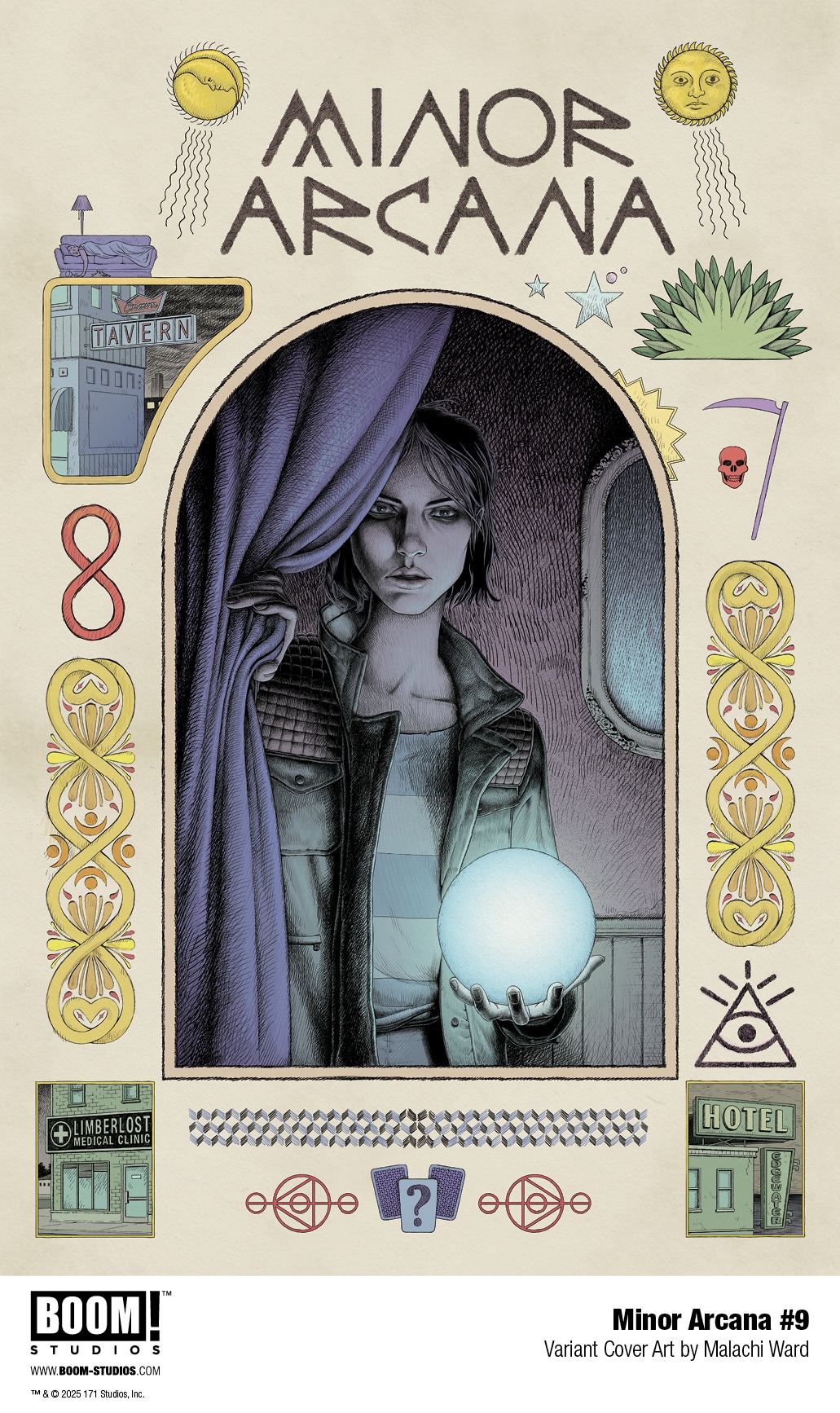 Minor Arcana #9 features main cover art by series creator Jeff Lemire, and variant covers by highly acclaimed illustrators Paulina Ganucheau, Tula Lotay, and Malachi Ward. Additionally, each issue of Minor Arcana will feature a special tarot card variant cover illustrated by Jeff Lemire culminating in a full tarot deck at the end of the series!