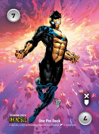 LRG’s OverPower convention floor space will be located in Booth #2629, and activities at the booth will feature game exhibitions, game-play merchandise (full decks, booster packs, booster boxes, power card stations, starter decks, hats, beanies), and Comic-Con exclusive giveaways – including a limited edition single-player game mat featuring never-before-seen artwork by Raymond Gay of The Darkness, and a special advance promo card from OverPower’s Invincible/Skybound-themed set coming in 2026. The Invincible card – showcasing the titular character Mark Grayson as Invincible – has been created by celebrated artist Philip Tan.