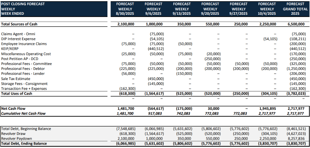 What’s also interesting is a new addition to the “maximum DIP Facility amount.” That’s the maximum amount that would be owed by Diamond to JPMorgan. Originally, that amount was $47.7 million through the closing of the sale of most of Diamond’s assets, after that sale, there’d be $8.9 million outstanding. This filing would have the DIP paid off from and after October 4, 2025. There’s about $6.15 million remaining at the end of August.