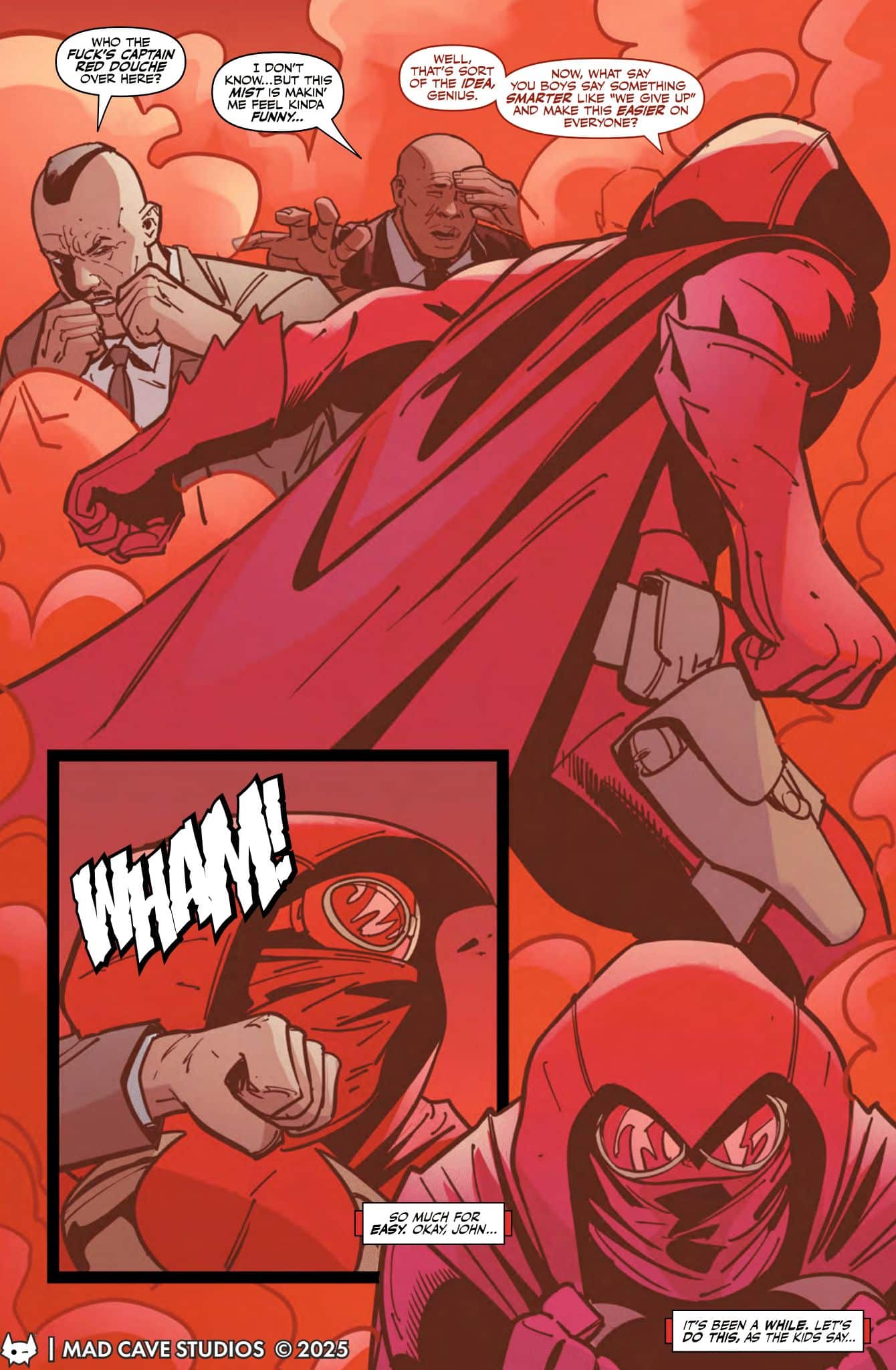 The Red Alert has been activated! The Crimson Mist gun is at the ready! Could this truly be it? Has the Crimson Justice finally returned? And if so, if “Justice is running red” once again, will our old hero be up for the new challenge of Dr Mayhem… at the site of their greatest battle? Find out this issue — and who or what Dr Mayhem truly is!