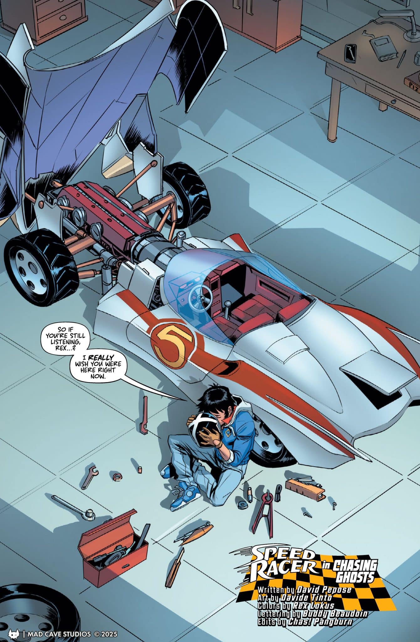 The mask comes off! When Speed Racer crosses paths with the mysterious Racer X, sparks fly on and off the streets in a high-octane showdown that pits brother against brother…even if neither of them knows it yet. But when the Mach 5 is stolen–with Spritle and Chim-Chim trapped in the trunk–Speed and Racer X must team up to take down a criminal biker gang led by the deadly Ace Deucey. Buckle up for wild stunts, emotional gut-punches, and the beginning of a bond that could save Speed’s life…if it doesn’t wreck him first!