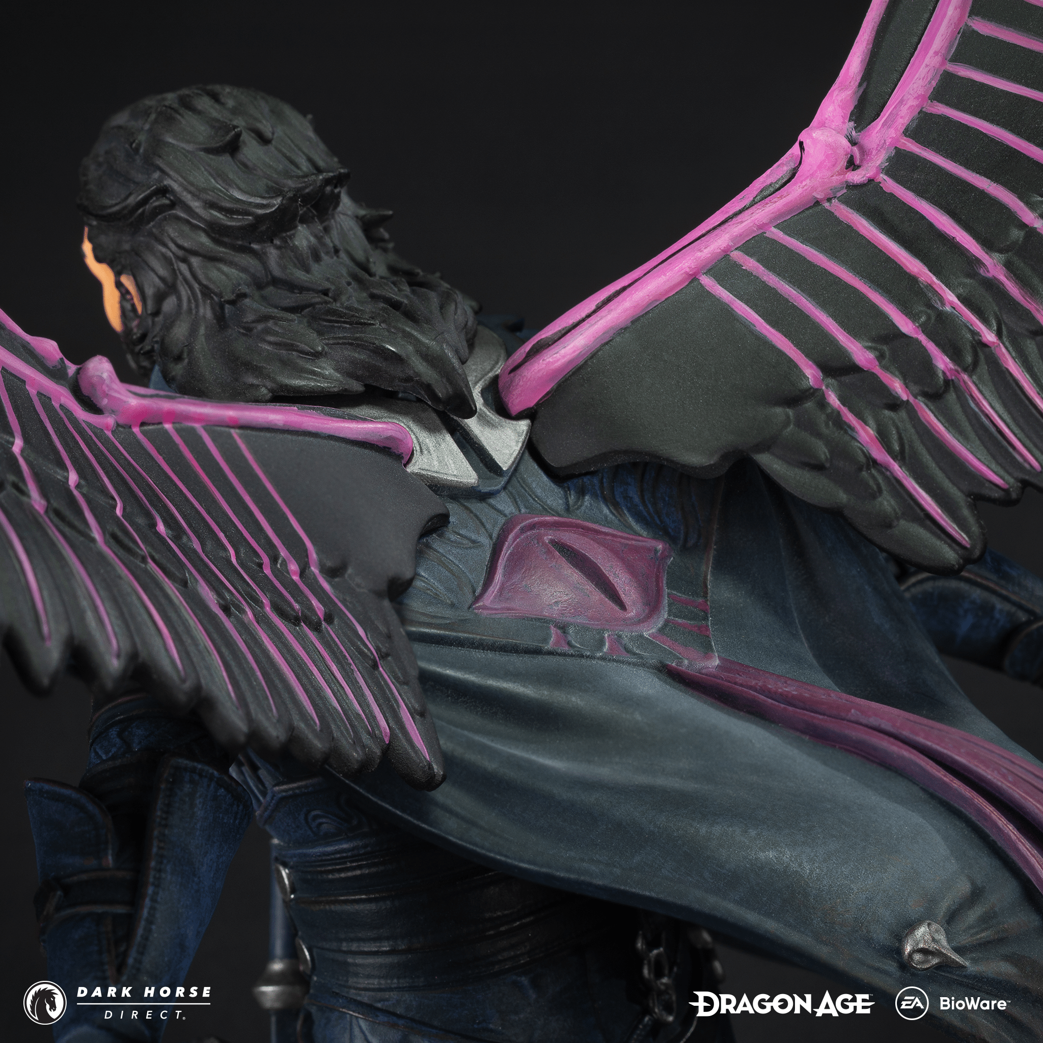 Standing at 9.25” tall atop a 6” deep sculpted eagle headstone, Lucanis has been brought to life in meticulous detail by Bigshot Toyworks and painted by J.W. Productions. Lucanis’ signature Wings of Antiva give this statuette a width of 9.125”.