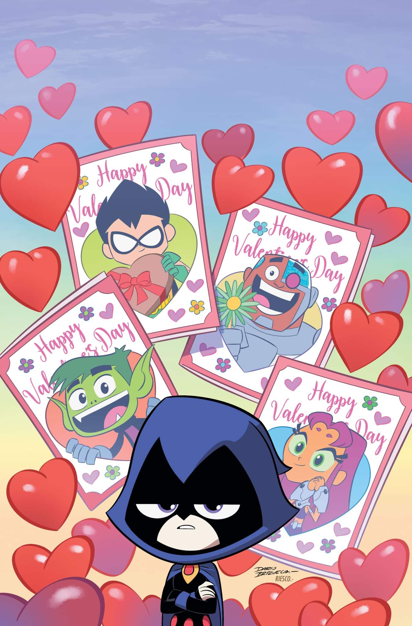 Everybody knows that Robin has a crush on Starfire (except for maybe Starfire), so of course, the Titans are braced for any wacky hijinks in February. But when Starfire opens a mystery package full of plushies and hearts and bouquets, she’s shocked to find a note that says, “From your secret admirer…to Raven.”