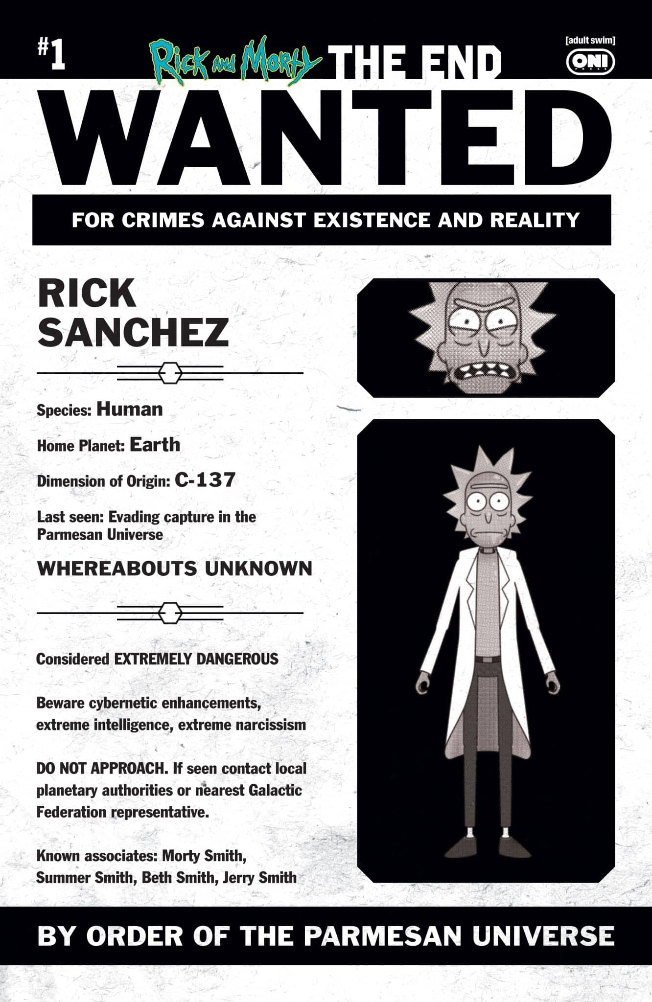 Rick Sanchez, the most wanted man in this and every other universe, is on the run. With a bounty on his head, every government, military, pirate, mobster, bounty hunter, bail bondsman, religious institution, theater troupe, circus clown, and endangered species is on the hunt to bring in Rick—DEAD OR ALIVE. The only one who can bring Rick in warm is the one person who knows him best: Morty Smith. But Morty’s not the only Smith hot on Rick’s trail . . . “Space Beth” Smith is determined to bring Rick in, and she doesn’t particularly care how. Now it’s just a question of who can get to him first!
