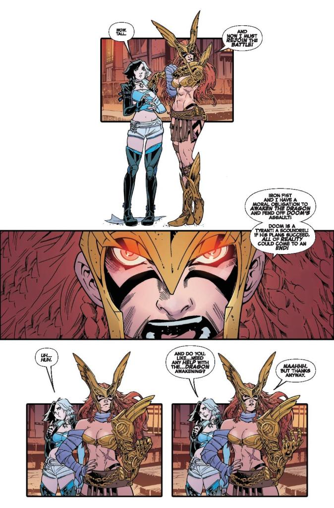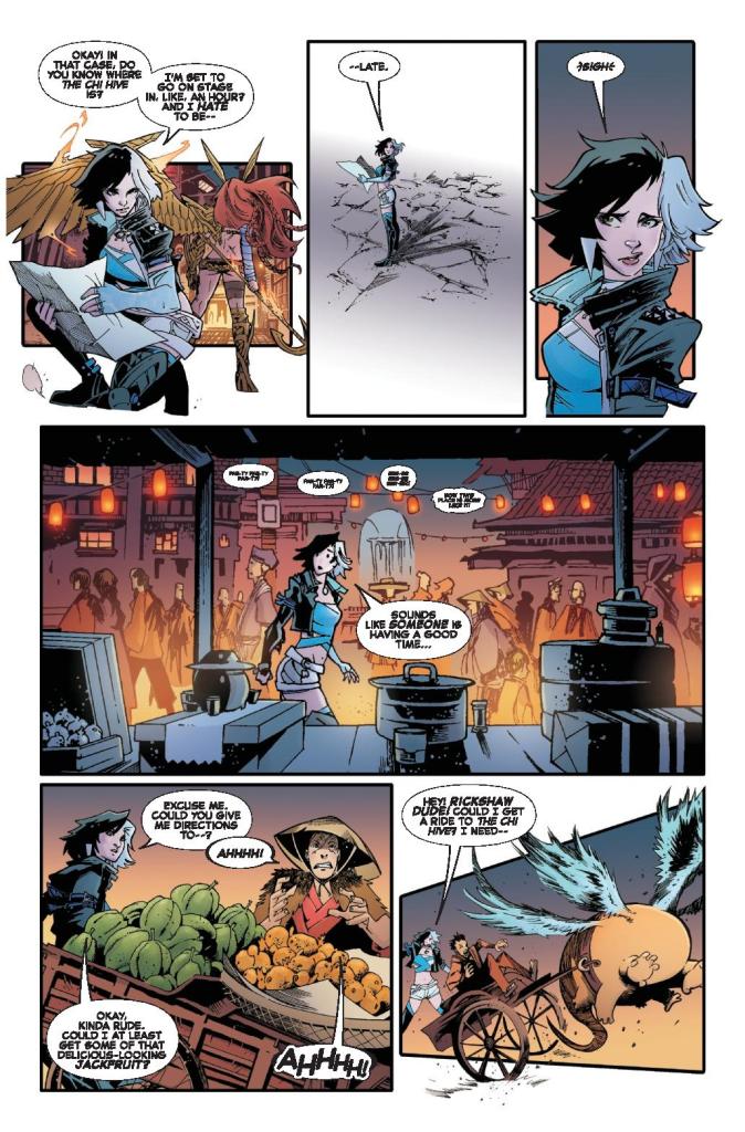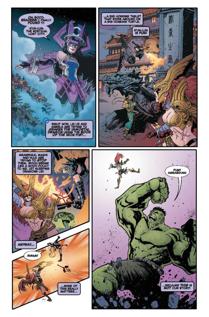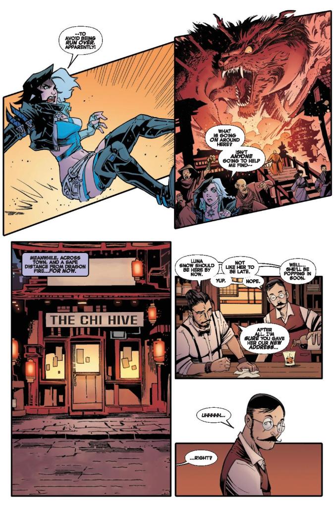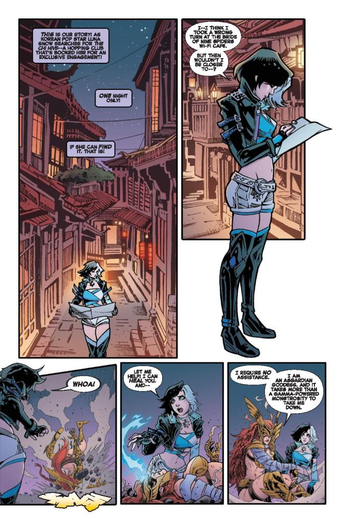 Luna Snow’s latest adventure begins with what should be a career-making concert at the mystical Chi Hive tavern in K’un-Lun. But getting there isn’t easy. On her search, she stumbles into a clash of titans: Daredevil and Angela attempting to awaken the Immortal Dragon with the Book of the Iron Fist, opposed by Magik and Hulk, who are determined to stop them. Between drinking games, Doombots, and squids, Luna has her hands full — and if she can’t find her way through the chaos, her audience may never hear her sing.