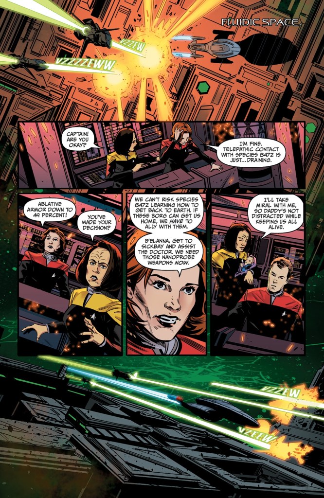Stuck between a rock and a hard place, Captain Janeway and the Voyager crew agree to ally with a collection of Borg deep in fluidic space, and Seven plunges into the collective. They may be Borg, but there’s something… strange about them. Something alluring. Especially when it comes to a particularly individualistic member, Nine. Together, Nine and Seven might be able to build a deflector and help their crew members escape back to normal space — but that’s assuming they stay hidden from Species 8472 bent on their elimination.
