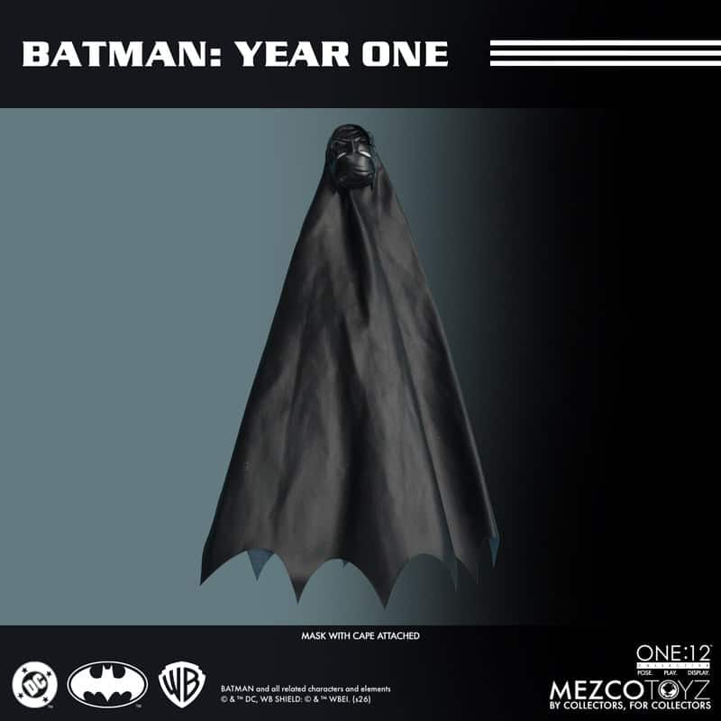Equipped with an experimental arsenal, Batman comes prepared with batarangs, explosives, a blowgun with dart effect, a recording device, a floodlight, and additional accessories recreating key moments from Year One.