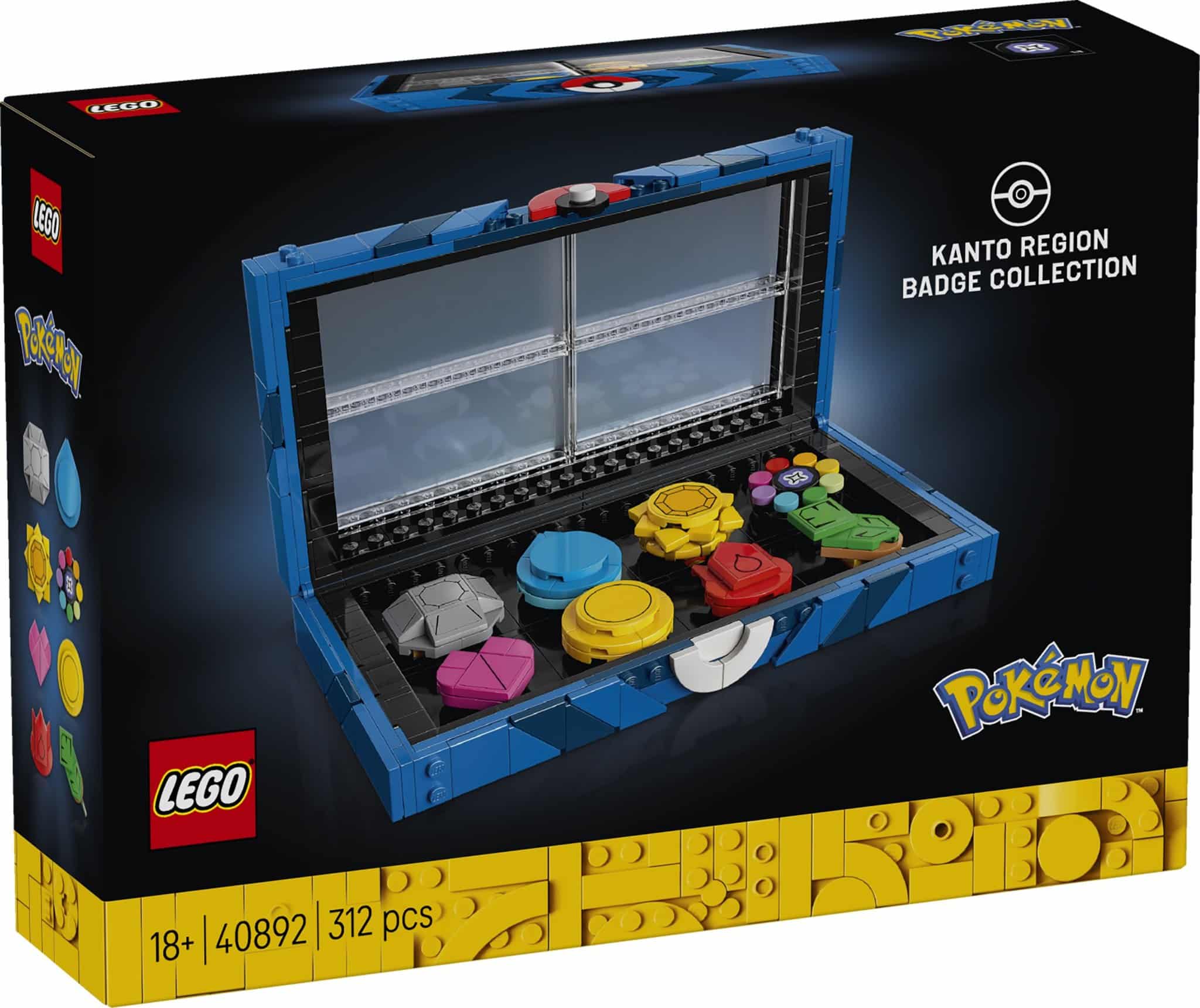 - Overview: Exhibit your Trainer battle prowess with the LEGO® Pokémon™ Kanto Region Badge Collection (40892) display box. Inside the case are all 8 Pokémon Kanto region badges, instantly recognisable to Pokémon fans. Remove them to show a fellow Pokémon fan or keep them in the case, secured with a catch inspired by a Poké Ball. This 312-piece LEGO® Pokémon™ set measures over 1 in. (3 cm) high, 7.5 in. (19 cm) wide and 4 in. (10 cm) deep.