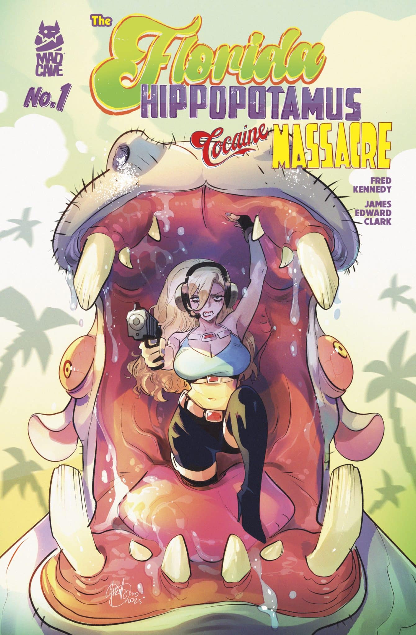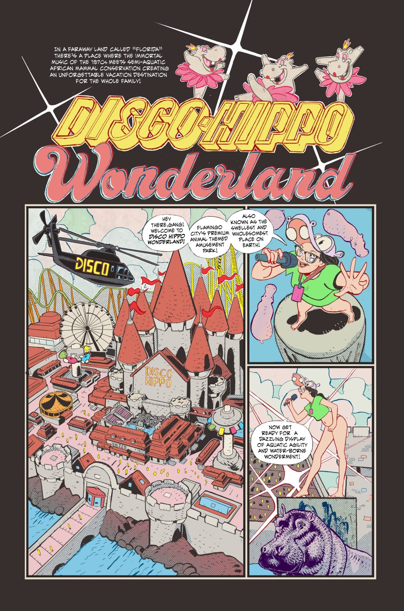 Disco Hippo Wonderland is the number one amusement park in Flamingo City. But few realize its corpulent owner, Jans M’jor Discau, is about to release the most potent drug ever created: Coke45! Fortunately for humanity, Agent Clarke Nebraska is on the case! She’ll bring down Discau come heck or high water! That was the plan, until her undercover agent, Tico Senecoza, was captured! And before she can rescue him, Miquel—Tico’s sexy loose cannon of an older brother beats her to the punch, storming into the park with bullets flying. Discau panics, dumping the Coke45 into the hippo enclosure and letting them loose on the park, before fleeing into Wonderland’s tunnel network! Nebraska’s plans are totally off the rails, and things get worse when a marijuana smoke fueled hurricane drowns the park in torrential rain! Now it’s up to Nebraska and Miquel to create an uncomfortable truce to bring Discau down before he escapes!