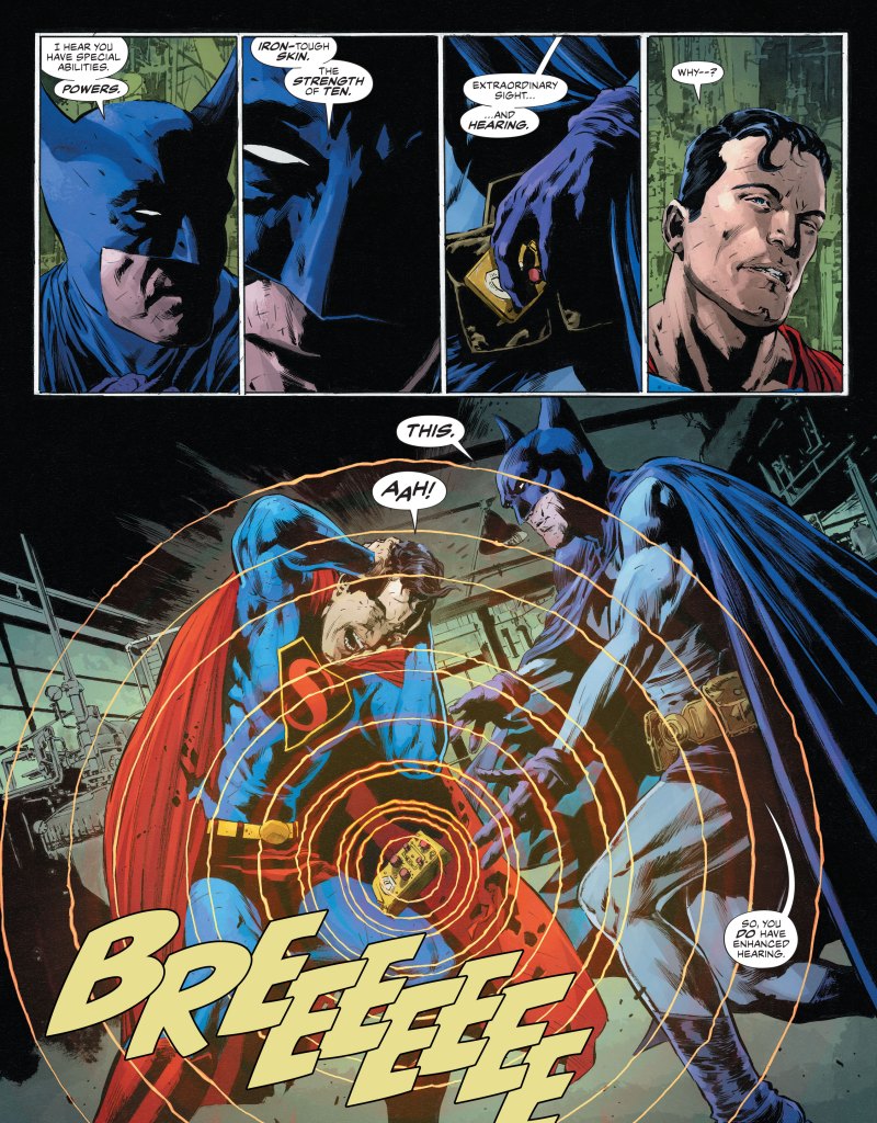A cloud of fear has settled over the city, and the Scarecrow has the people of Gotham right where he wants them. Jim Gordon will take the fight right to Scarecrow’s seat of power… City Hall! But will Gordon have to challenge him on his own? Where’s the Bat-Man? The Dark Knight has found himself staring down a power unlike any he’s ever seen: a man of unlimited strength. A superman. And he has a lot of questions for the Caped Crusader. Will these two find common ground in time to thwart the Scarecrow and Hangman’s endgame?