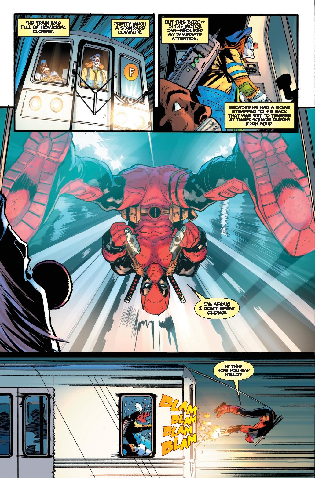 NO MORE CLOWNING AROUND! A deadly subway caper shows DEADPOOL the truth: The secret message he received was right! And with intel on crimes before they are committed, Wade Wilson has no choice but to do the right thing: exploit his insider knowledge for PROFIT and COLD HARD CASH! Merc’s gotta merc! But can he outrun the horrible pain of his tragic mistake, or is this all setting Wade up for the worst fall of his life?
