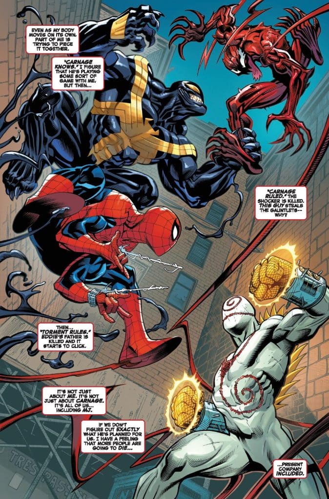 UNRELENTING TORMENT… for Spider-Man, Venom and Carnage leads to the most unexpected team-up in Spidey History! But even if Spidey wins, he may still lose… because Torment learns not one, but two shocking truths about his foes!