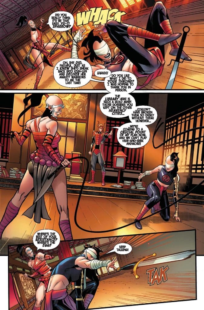 ALL OUT WAR AS K’UN-LUN BURNS! The conquest of the SEVEN CITIES rages as K’UN-LUN appears over NEW YORK CITY! Can IRON FIST, ELEKTRA and WHITE FOX hold the line as a certain ASGARDIAN tilts the scales? A portal from ATTILAN delivers a shocking strike! Guest-starring KARNAK & AERO!!!