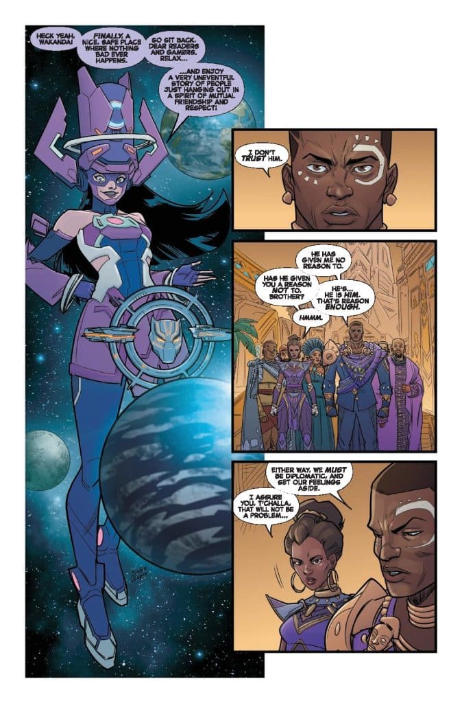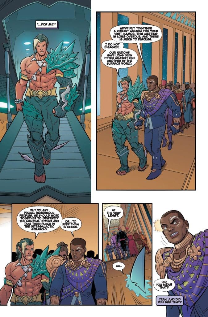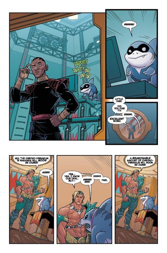THIEF OF THE DEEP! Namor and Black Panther have a long history of bad blood between them, but when Namor shows up at the Galactic Empire of Wakanda with nefarious goals, there’s no hope that diplomacy will win the day. The king of Atlantis has secretly brought Jeff the Land Shark along in hopes of stealing Wakanda’s Chronovium! Will T’Challa and Shuri catch these fishy thieves red-handed?