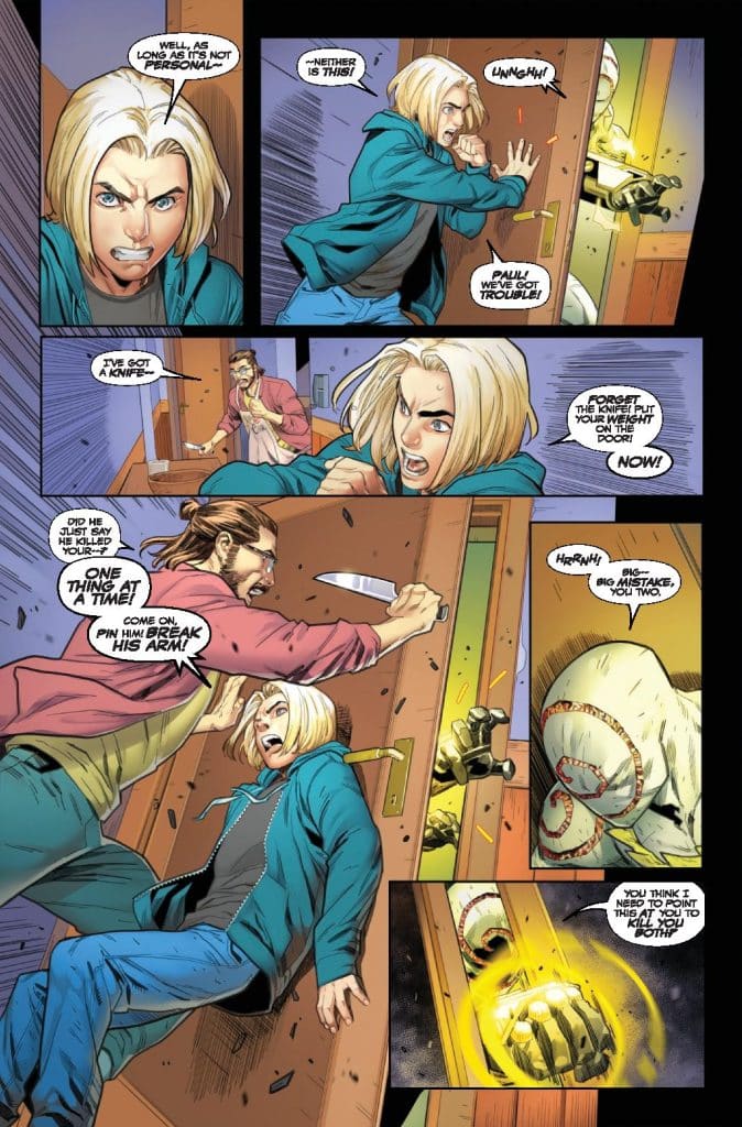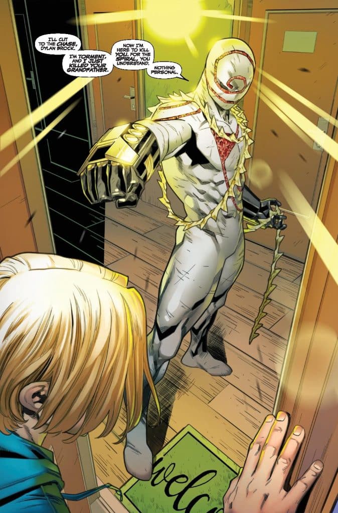 DEATH SPIRAL PART SIX! The serial killer Torment is following the path of the Death Spiral… and it’s led straight to Dylan Brock! Now the son of Venom is alone, injured and on the run… and Venom’s other child might be his only hope. But will Carnage choose to help Dylan… or kill him all over again? Because SOMEONE’S got to die…