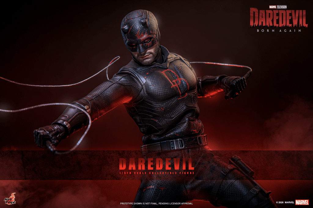 Celebrating the return of Daredevil: Born Again, the Daredevil 1/6 Scale Collectible Figure by Hot Toys presents the masked vigilante in a dramatic new all-black outfit.